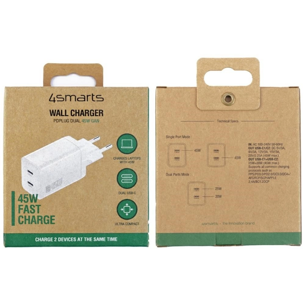 Netstroomlader 4smarts PDPlug Dual 45W GaN, 2× USB‑C, wit