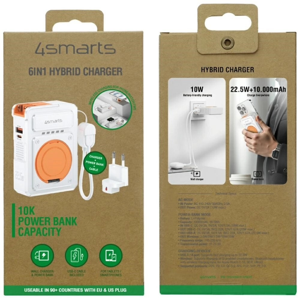 - 6‑in‑1: netstroomoplader, powerbank 10.000 mAh, Qi‑draadloze laadpad, USB‑C/USB‑A uitgangen, standaard, meegeleverde USB‑C‑kabel
