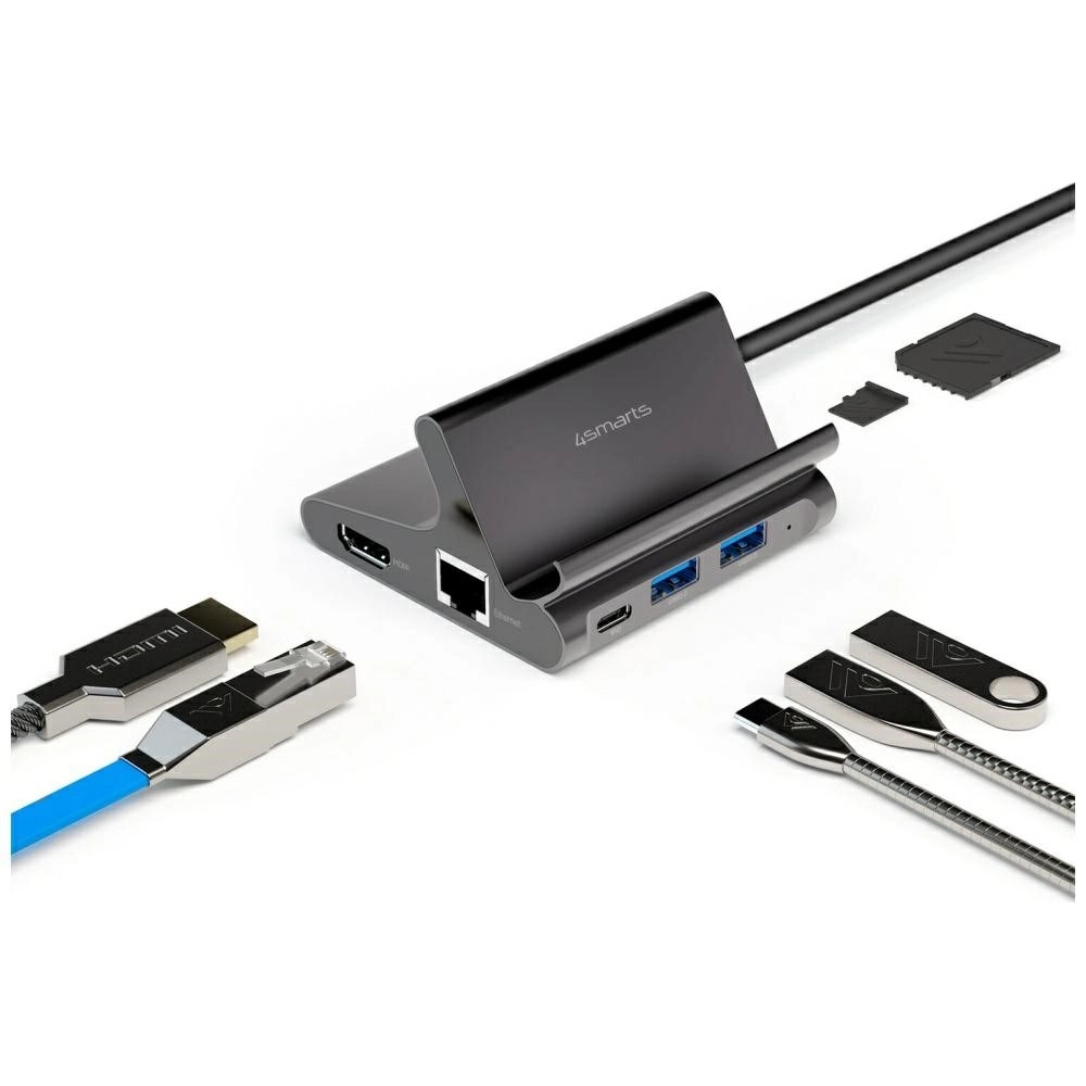 Sluit een extern beeldscherm aan via HDMI, randapparatuur via USB‑A, laad op en synchroniseer via USB‑C, lees data van SD/microSD en gebruik een stabiele bekabelde verbinding via RJ45 – alles in één compacte hub.