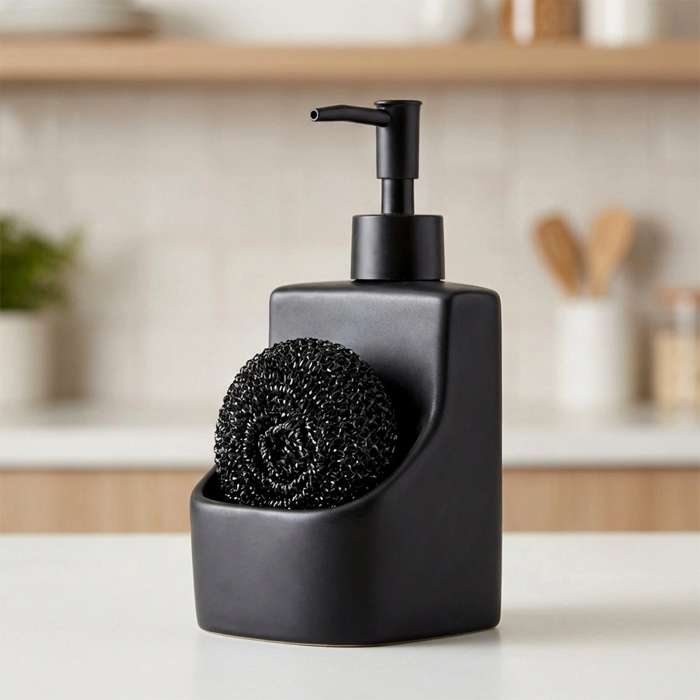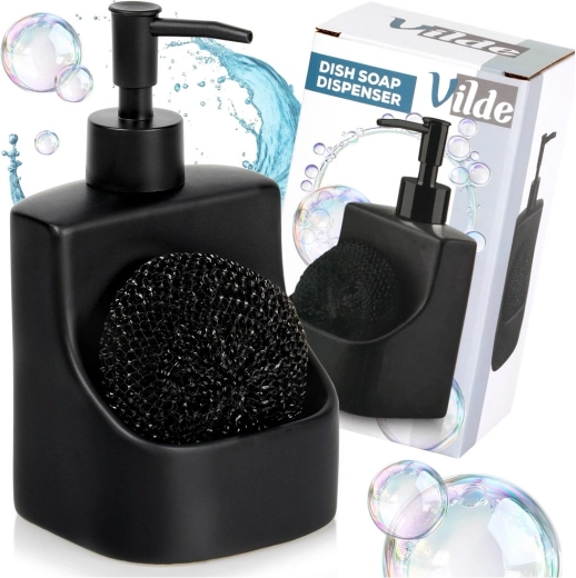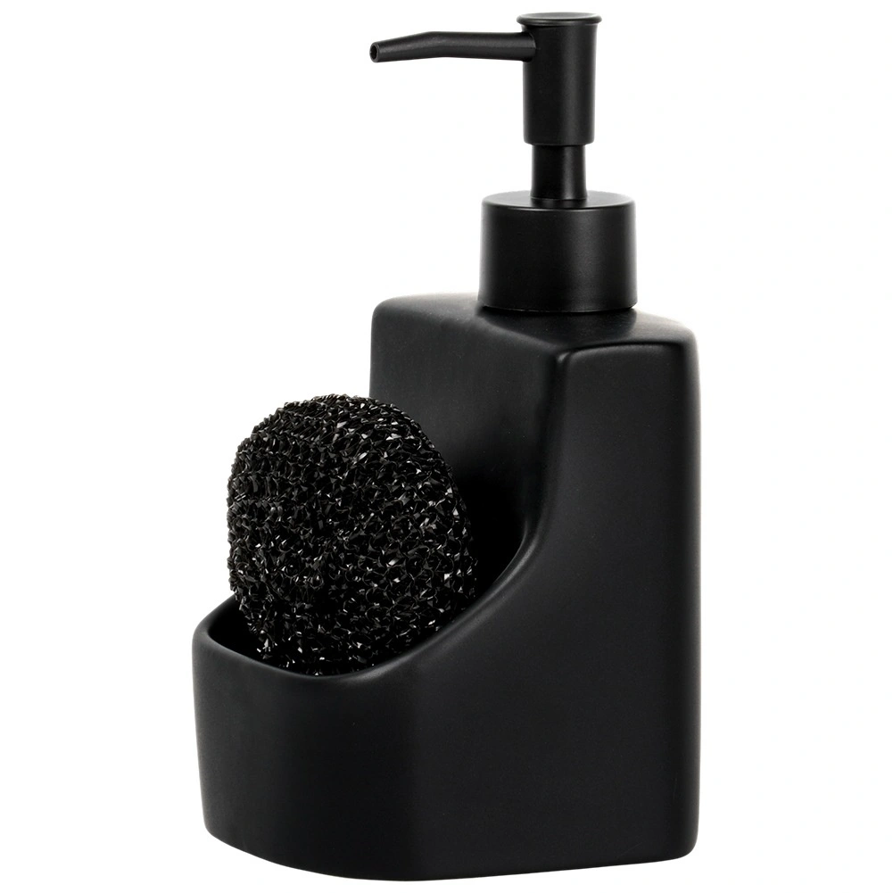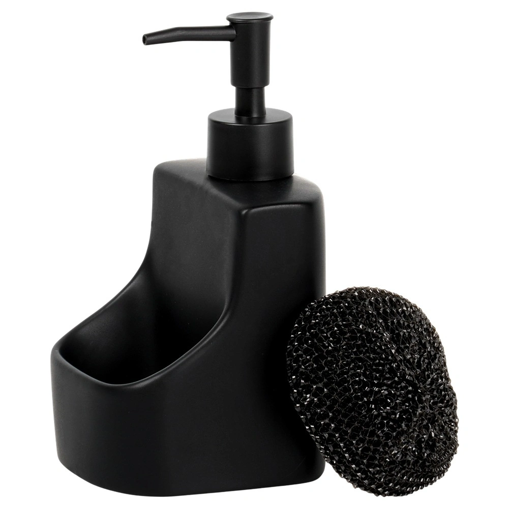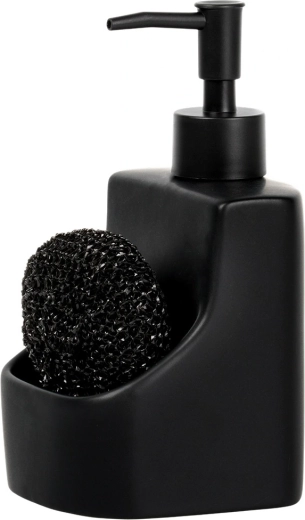 Elegante keramische dispenser voor afwasmiddel met geïntegreerd vak en zwarte spons met een inhoud van 400 ml. De matte zwarte afwerking, de praktische sponshouder en het makkelijk bijvullen maken dit tot een stijlvolle en functionele accessoire voor elke keuken en badkamer.