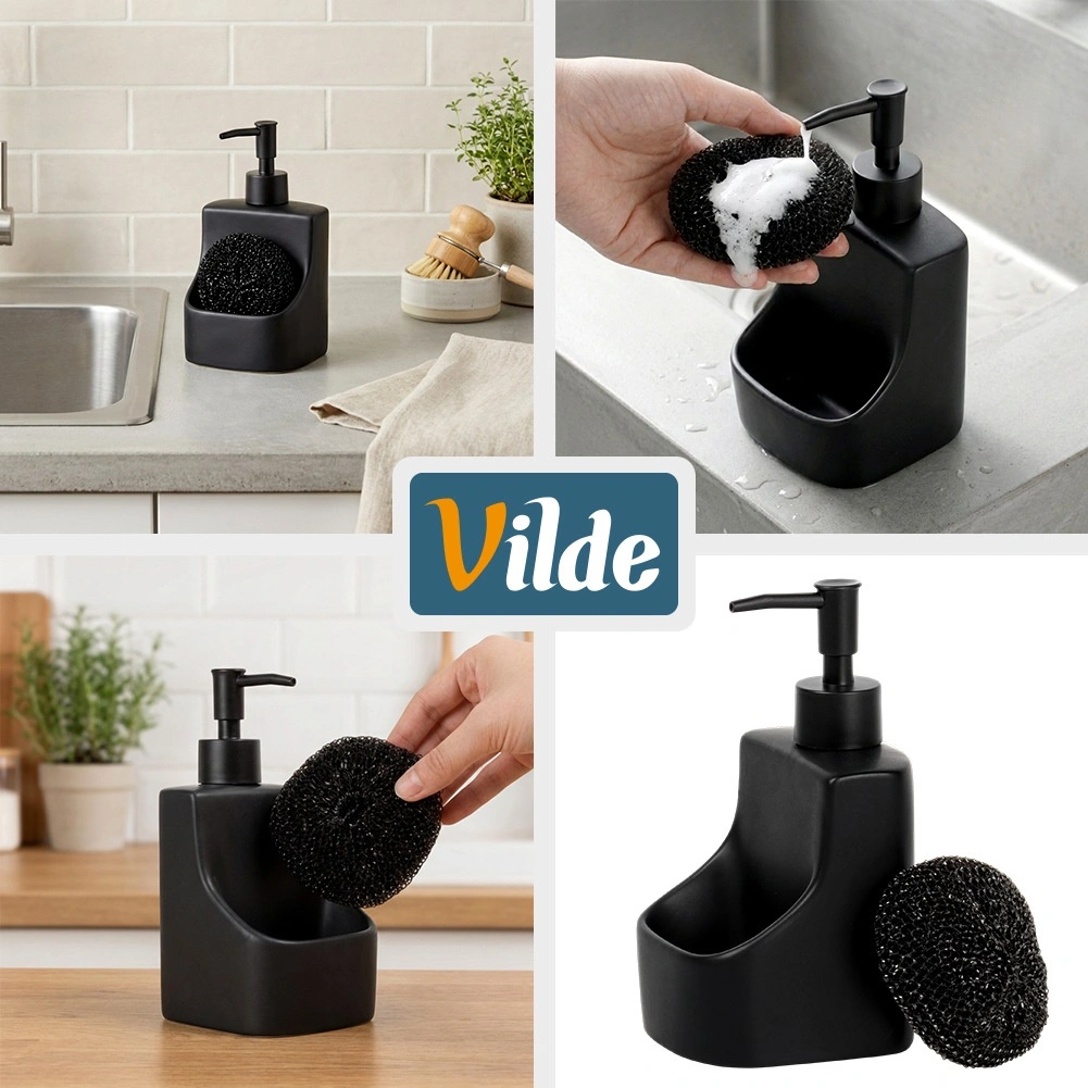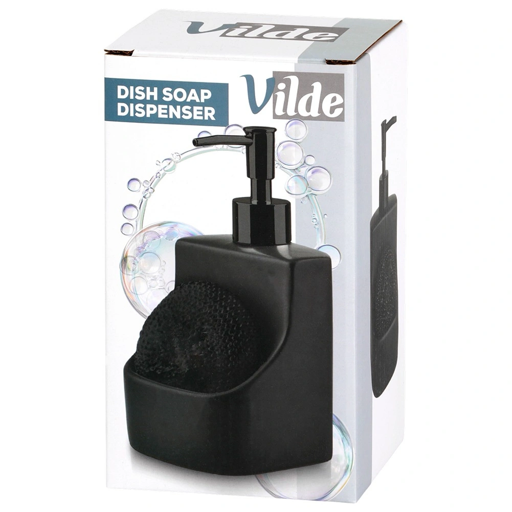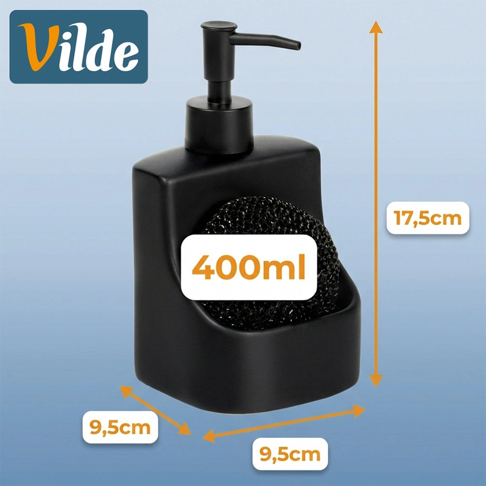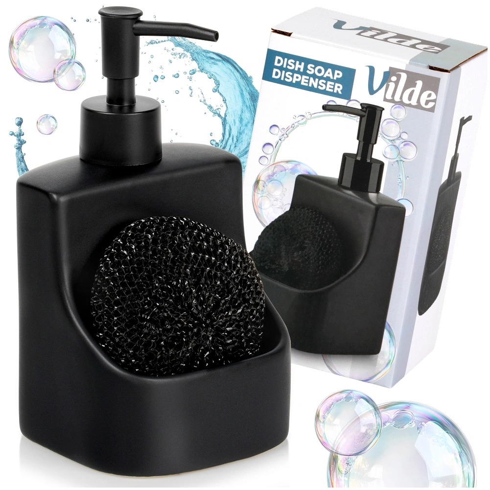 Elegante keramische dispenser voor afwasmiddel met geïntegreerd vak en zwarte spons met een inhoud van 400 ml. De matte zwarte afwerking, de praktische sponshouder en het makkelijk bijvullen maken dit tot een stijlvolle en functionele accessoire voor elke keuken en badkamer.