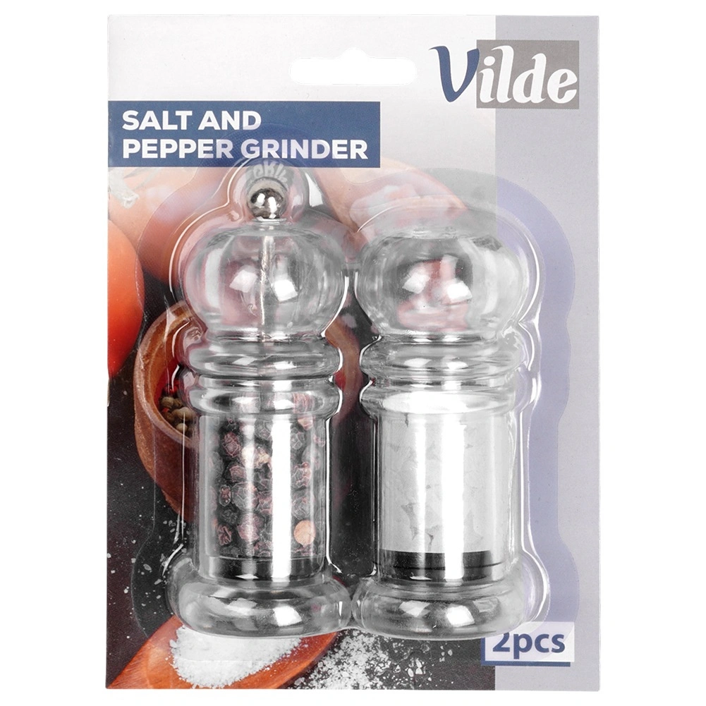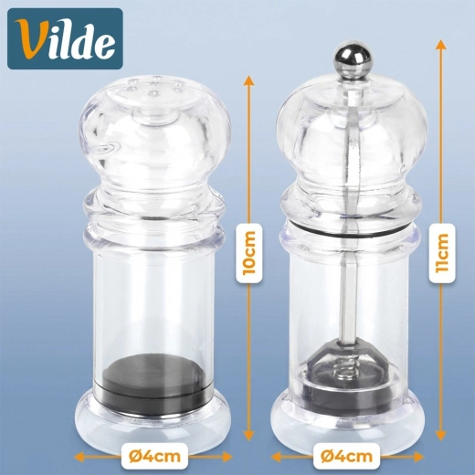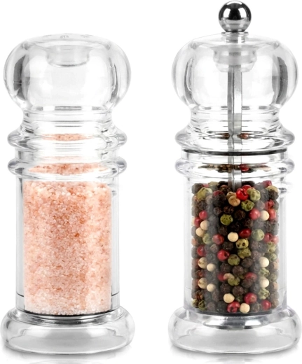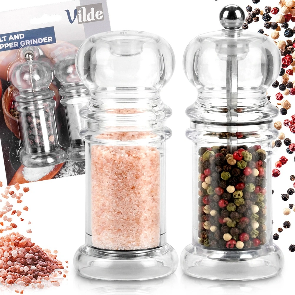 Praktische 2-in-1 set voor op tafel en in de keuken: een handmatige pepermolen met keramisch mechanisme en een zoutvaatje van helder acryl. Het transparante lichaam maakt het eenvoudig om de hoeveelheid te controleren en zout van peper te onderscheiden, terwijl het klassieke design in elk interieur past. Ideaal voor thuis en in de horeca, makkelijk te vullen en te reinigen.