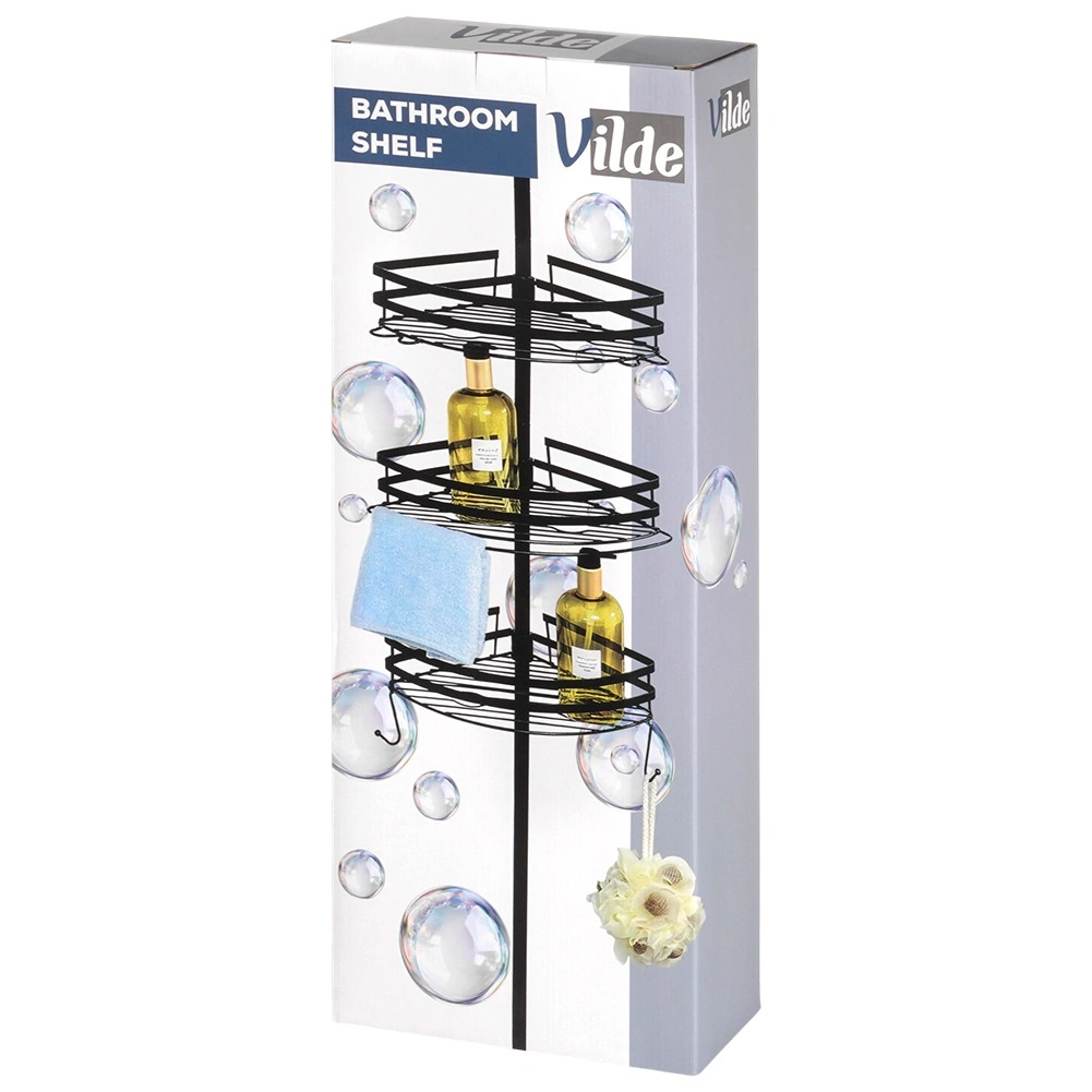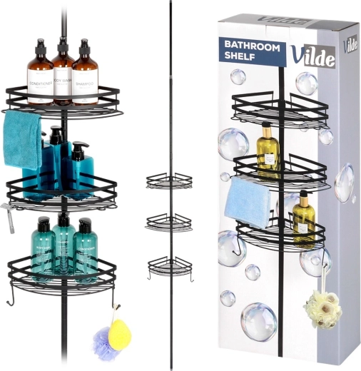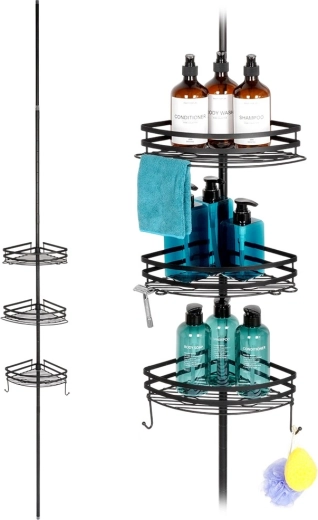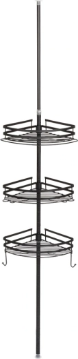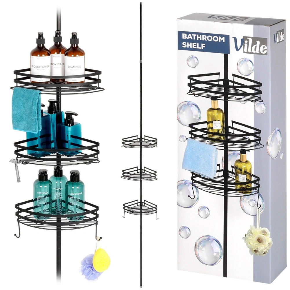 Praktische hoekdoucheplank met een telescopische klemstang zonder boren en 3 ruime mandjes voor shampoos en cosmetica. Duurzame volledig metalen constructie in matzwart, verstelbare hoogte en snelle waterafvoer dankzij de draadbodem zorgen voor orde en droogte in de douche en boven het bad.