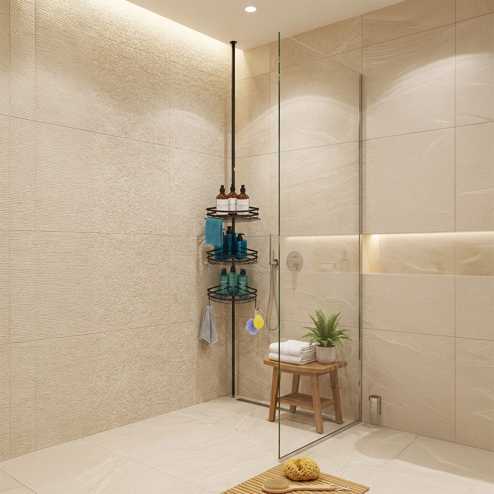 Richt je badkamer stijlvol en functioneel in. Deze hoekdoucheplank met telescoopstang wordt gemonteerd zonder boren – je klemt hem eenvoudig tussen vloer en plafond. De verstelbare hoogte laat je de positie van de planken exact afstemmen op je douche of badkamer, terwijl de matzwarte metalen afwerking een moderne look en lange levensduur biedt.
