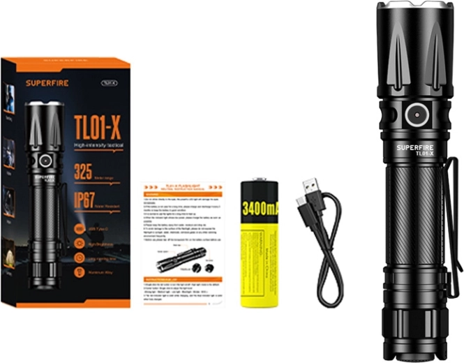 De Superfire TL01-X is een robuuste tactische zaklamp ontworpen voor professionals en outdoorliefhebbers. De hoge lichtopbrengst van 1800 lm en een reikwijdte van 325 m zorgen voor betrouwbare zichtbaarheid in elke situatie, terwijl de duurzame aluminiumlegering met IP67-bescherming beschermt tegen stof en water. Geïntegreerde beveiligingen bewaken de elektronica en de batterij, zodat u kunt rekenen op een lange levensduur en veilig gebruik.