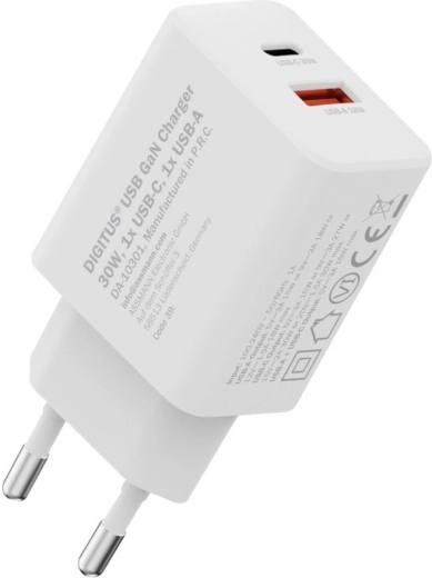 Netvoedingsadapter USB GaN-oplader 30 W, 1× USB‑C en 1× USB‑A, wit