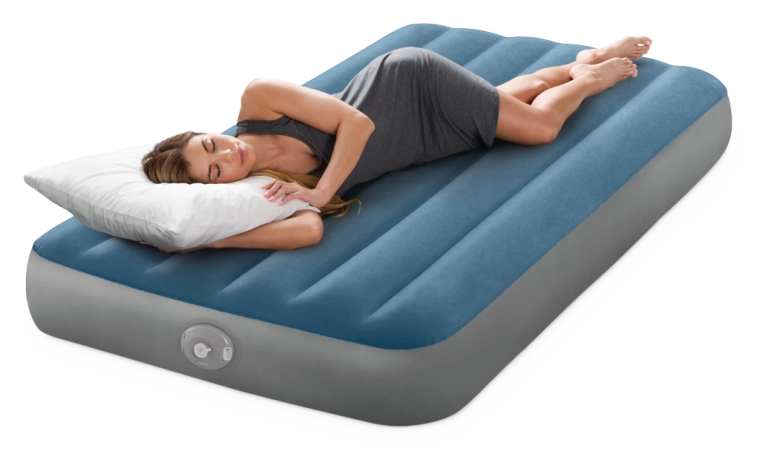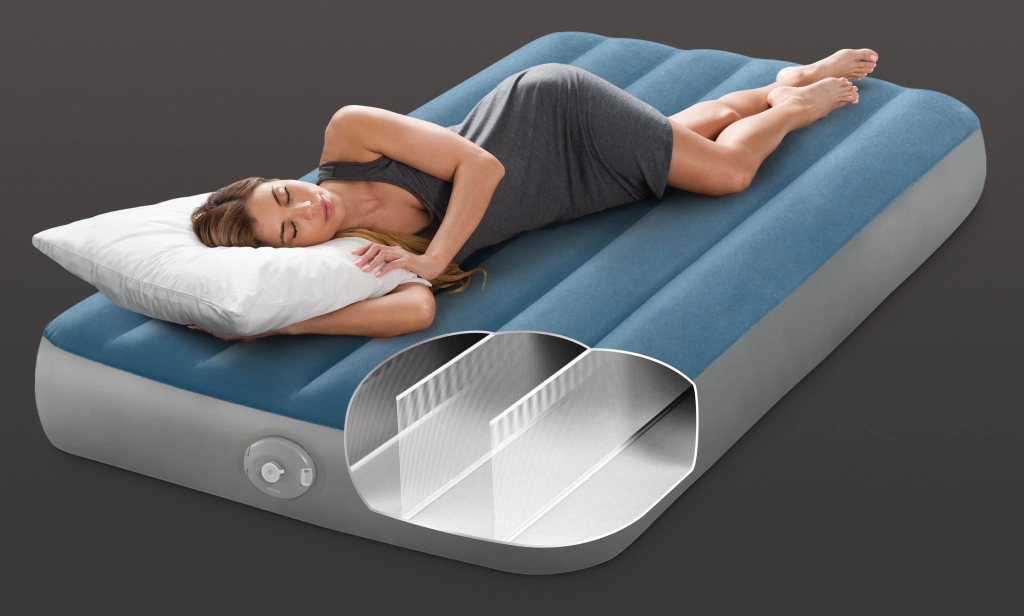 Het opblaasbare bed Twin Prestige Downy is ontworpen voor een stabiele en comfortabele slaap. De gepatenteerde Fiber‑Tech-constructie met duizenden sterke vezels verdeelt de druk over de volledige lichaamslengte, terwijl het fluweelzachte blauw‑grijze oppervlak prettig aanvoelt en het verschuiven van het laken voorkomt.