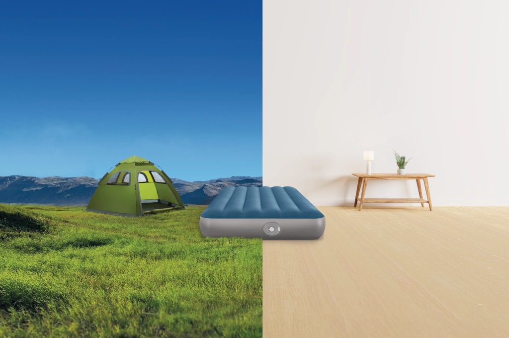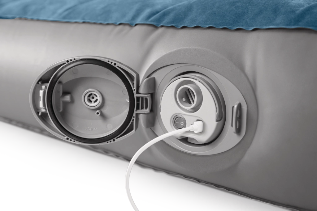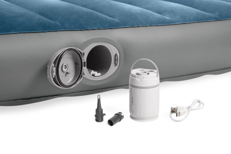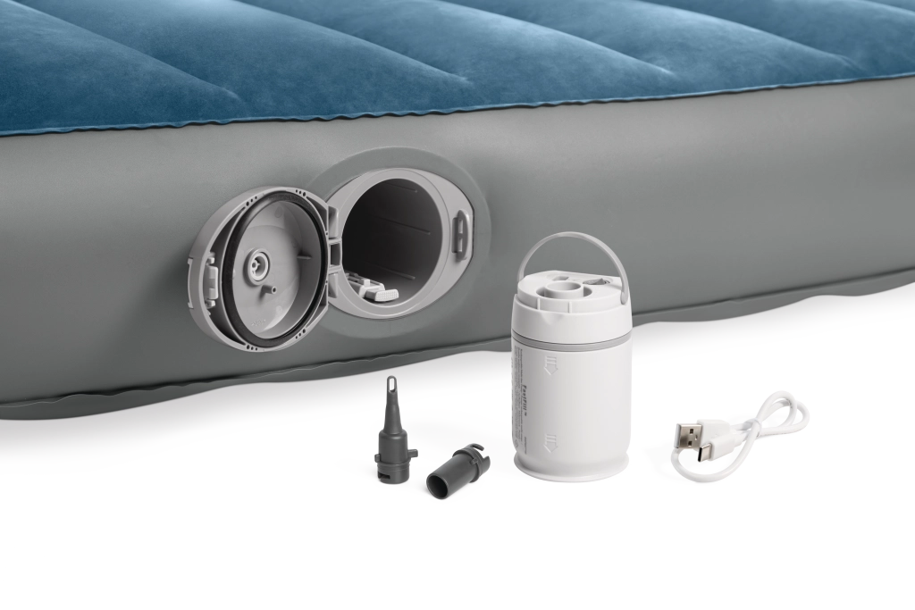 De geïntegreerde oplaadbare pomp met Li‑ion‑accu schuift rechtstreeks in de opening aan de zijkant van het bed en zorgt voor snel opblazen en leeg laten lopen. Opladen via USB duurt ongeveer 3 uur, de pomp heeft automatische uitschakeling na 8 minuten en dankzij twee opzetstukken kun je hem ook gebruiken voor andere opblaasproducten. Is de accu leeg, dan kun je het bed eenvoudig bijpompen via het 2‑in‑1‑ventiel.
