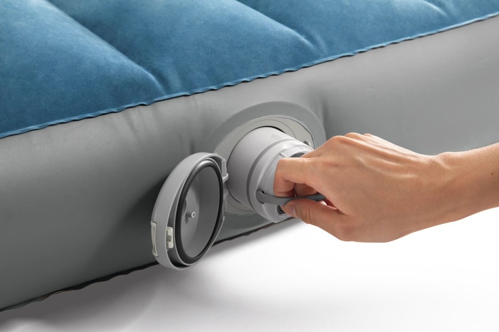 Het praktische ventiel met kapje beschermt tegen vuil en dient tevens als opbergruimte voor de pomp en accessoires. Het lage profiel van ongeveer 22 cm maakt opstaan en gaan liggen gemakkelijker. Ideaal als draagbaar logeerbed voor gasten, voor kamperen of weekendtrips.