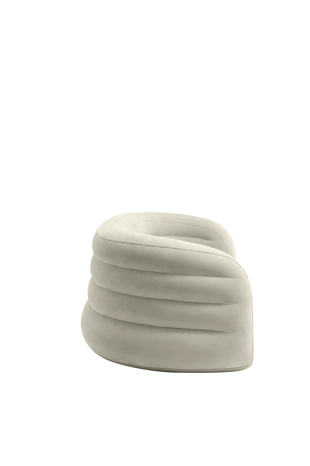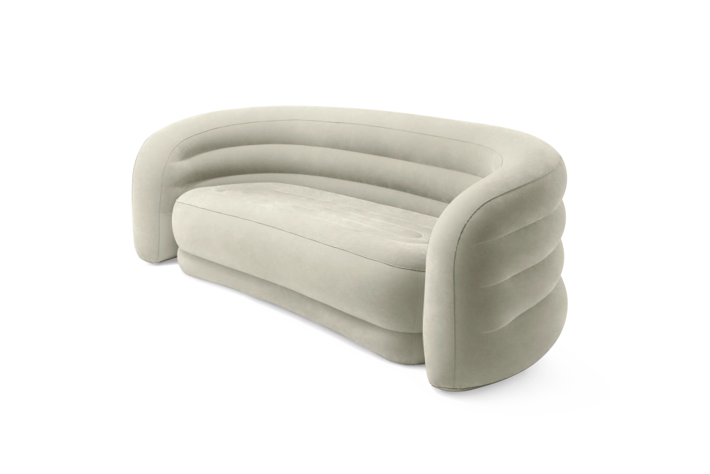 De opblaasbare sofa Curve valt op door haar afgeronde lijnen die organisch en gezellig aandoen. Het pluche fluweel in een neutrale olijfbeige tint voegt elegantie toe en voelt aangenaam aan. De constructie is stevig maar licht en gemakkelijk te verplaatsen – ideaal voor een flexibel interieur.