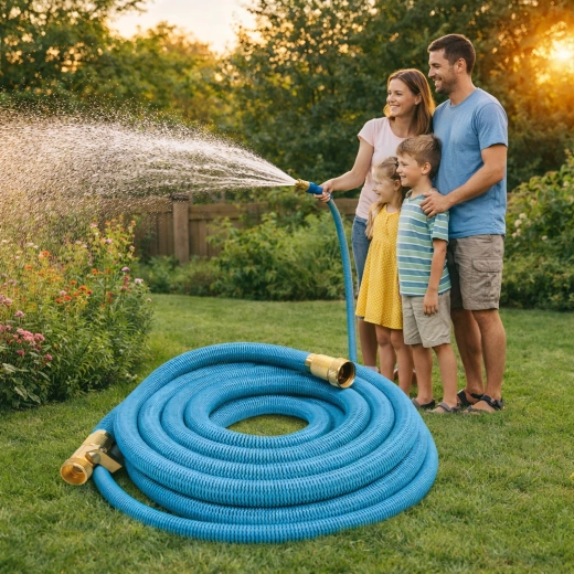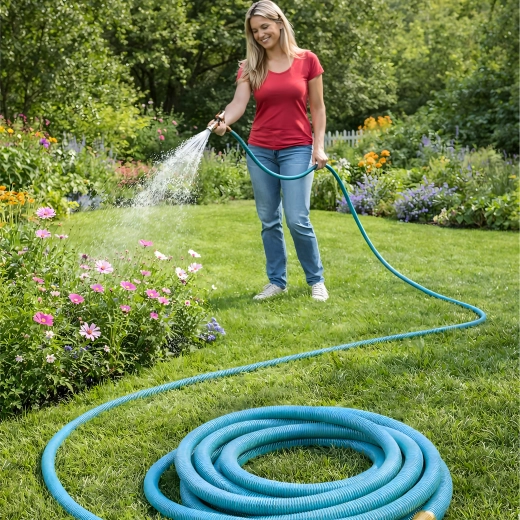 De slang verlengt bij waterdruk tot drievoudige lengte en krimpt na uitschakelen terug tot een compact formaat. De knikbestendige mantel zorgt voor een gelijkmatige doorstroming zonder knopen.