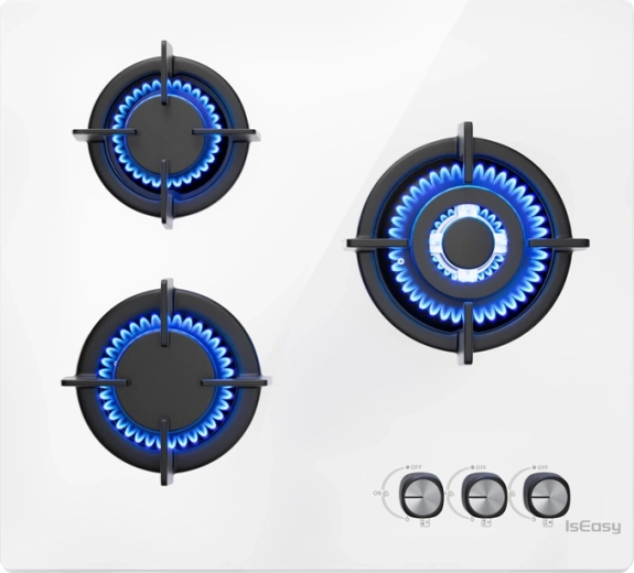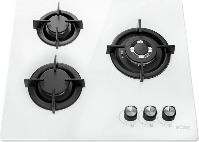 De elegante IS EASY gaskookplaat met drie branders en een wit glazen paneel biedt snel en efficiënt koken, nauwkeurige vlamregeling en eenvoudige reiniging. Krachtige branders van 3,3 kW, 2,7 kW en 1,75 kW zorgen voor comfort bij bakken, koken en sudderen, terwijl het gehard glas en de elektrische ontsteking voor gemak en veiligheid in elke keuken zorgen.