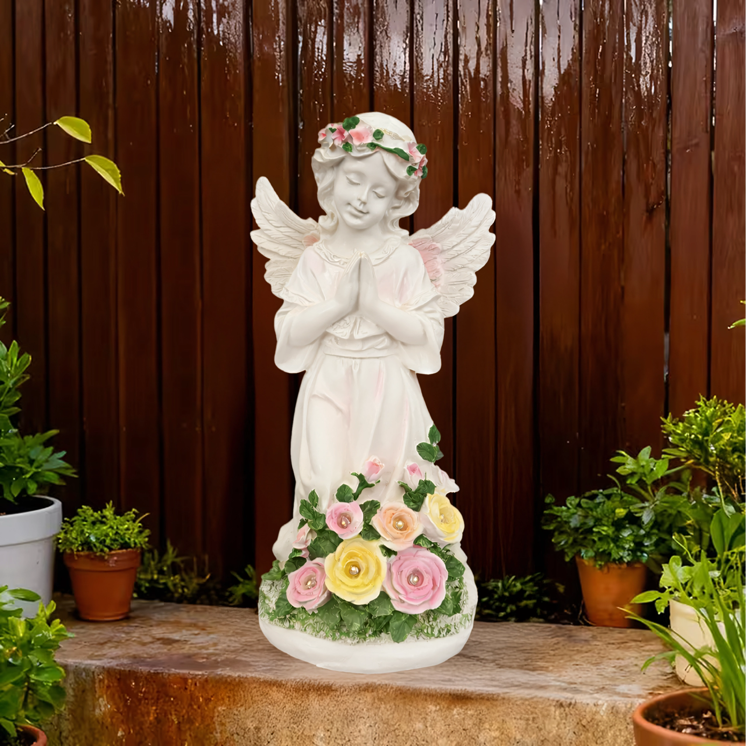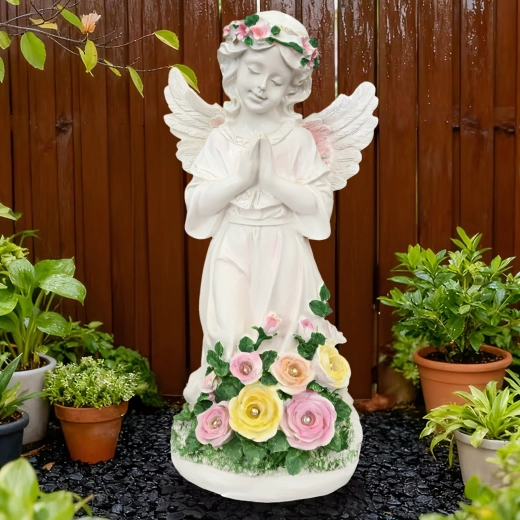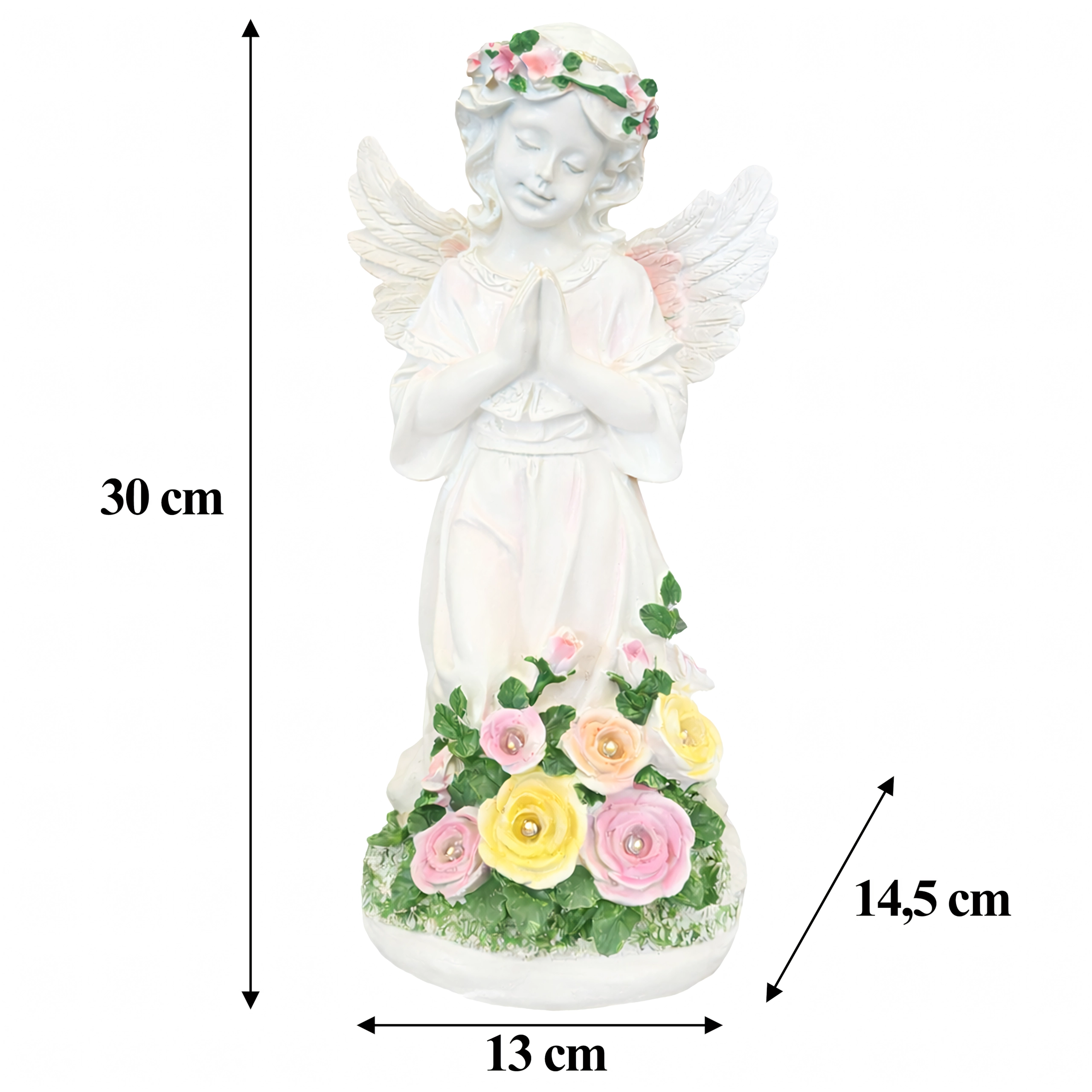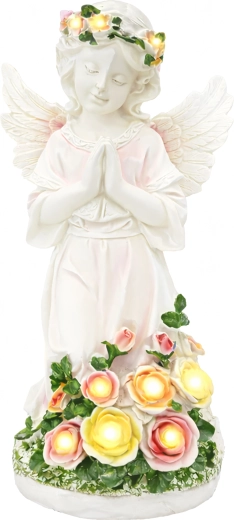 Dit decoratieve engelenbeeld in gebed valt op door de precieze afwerking, zachte gezichtsuitdrukking en rijk gevormde vleugels. De bloemenkroon en de met rozen versierde voet worden deels verlicht door geïntegreerde LED’s die de decoratie na zonsondergang in warm licht zetten. Ideaal als zonne-tuinlamp, stijlvolle decoratie bij de entree of voor een plek van bezinning.