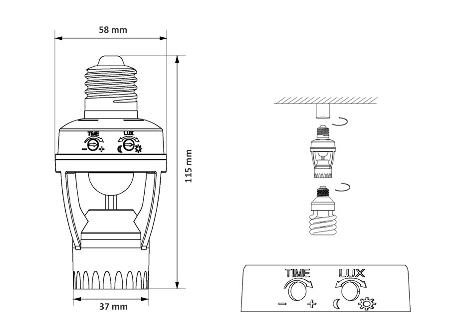 De installatie kost slechts enkele minuten: draai eenvoudig in de bestaande E27-fitting en plaats de lamp. Met de draairegelaars stel je gemakkelijk de nabrandtijd (TIME) en de drempel voor verlichting (LUX) in. De sensor gebruikt infrarooddetectie (PIR) en herkent betrouwbaar dag/nacht, wat energie en kosten bespaart.