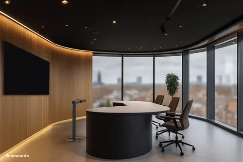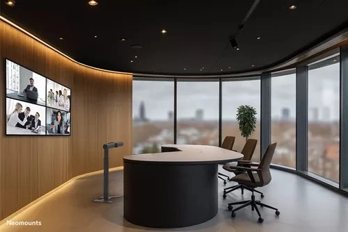 De universele vloerstandaard voor videobars NEOMOUNTS AV80-500BL biedt maximale plaatsingsflexibiliteit, verstelbare hoogte en een draagvermogen tot 10 kg. Ideaal voor vergaderruimtes en Microsoft Signature Teams Rooms (Front Row), zorgt hij voor optimale zichtbaarheid en een professionele presentatie van je videobar, PTZ-camera of soundbar (waaronder Logitech Rally).
