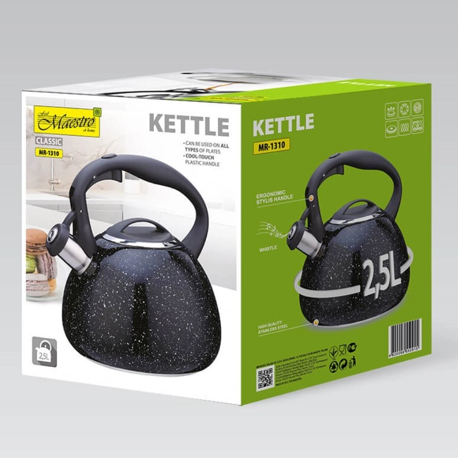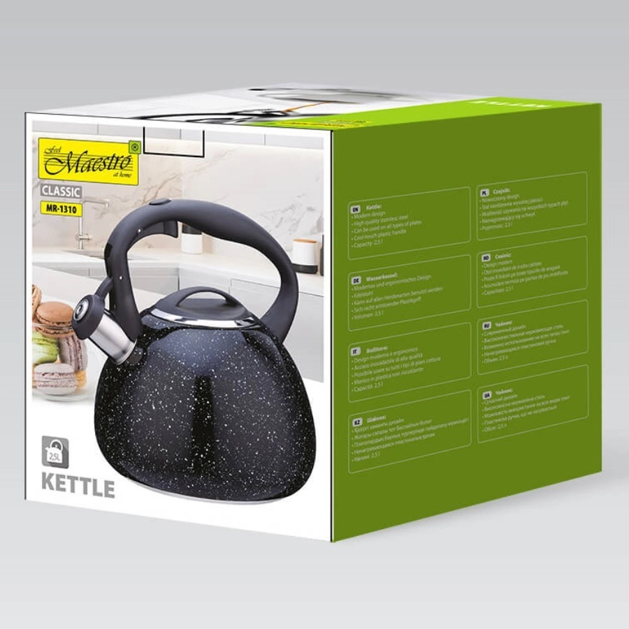 Zoek je een betrouwbare en elegante fluitketel voor op het fornuis? De MAESTRO roestvrijstalen ketel van 2,5 l combineert modern design met praktische functies. De brede bodem zorgt voor stabiliteit en efficiënte warmteoverdracht, terwijl het fluitdeksel op de tuit laat weten wanneer het water klaar is. Dankzij het afneembare deksel is vullen en onderhoud maximaal comfortabel.