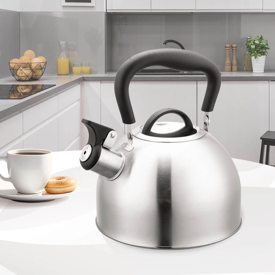 De ketel is uitgerust met een fluit die u veilig waarschuwt wanneer het water kookt, en een ergonomisch kunststof handvat met uitstekende thermische isolatie voor comfortabel en veilig schenken. De brede bodem zorgt voor snel en gelijkmatig opwarmen en compatibiliteit met alle soorten kookplaten, inclusief inductie.
