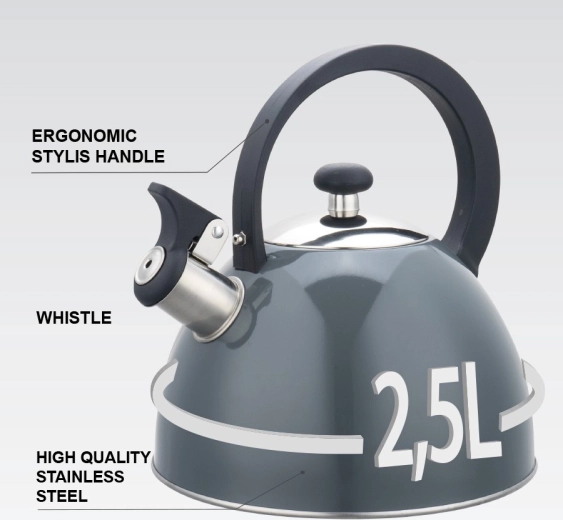 Praktische fluitketel van Maestro met een inhoud van 2,5 l van hoogwaardige roestvrijstalen kwaliteit, ideaal voor dagelijks thee- en koffiezetten. Dankzij het universele gebruik op alle type fornuizen, inclusief inductie, de meerlaagse kapselbodem voor snel en gelijkmatig opwarmen en het afneembare deksel voor eenvoudig reinigen, biedt hij veilig en comfortabel gebruik in elke keuken.