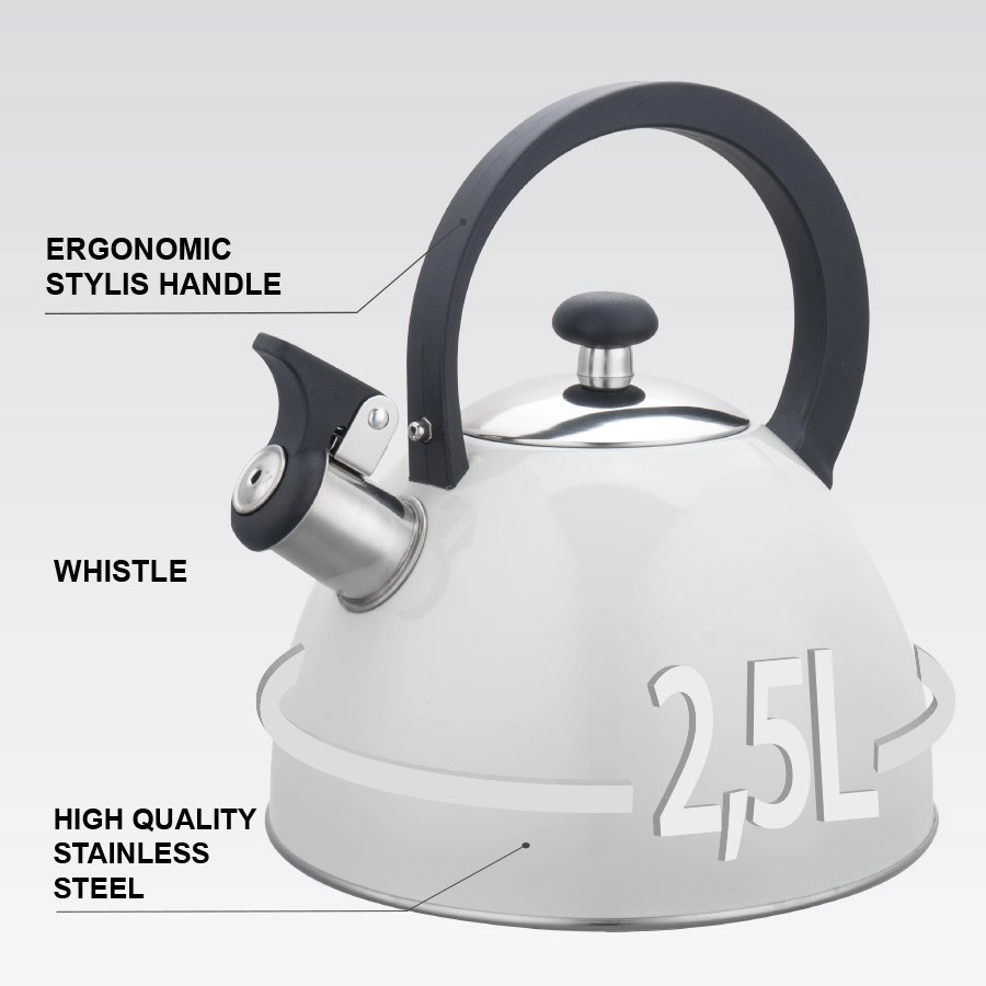 Praktische fluitketel Maestro met een inhoud van 2,5 l van hoogwaardig roestvrij staal, ideaal voor dagelijks thee- en koffiezetten. Dankzij de fluit word je veilig op het kookpunt gewezen, het gemakkelijk afneembare deksel vergemakkelijkt het bijvullen en reinigen en de meerlaagse kapselbodem zorgt voor snel en gelijkmatig opwarmen. Geschikt voor alle soorten kookplaten, inclusief inductie.