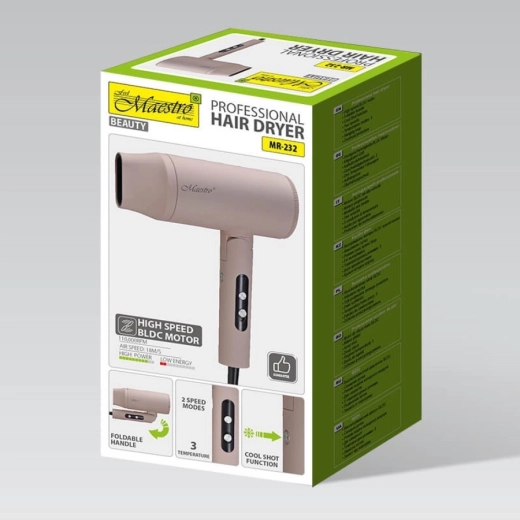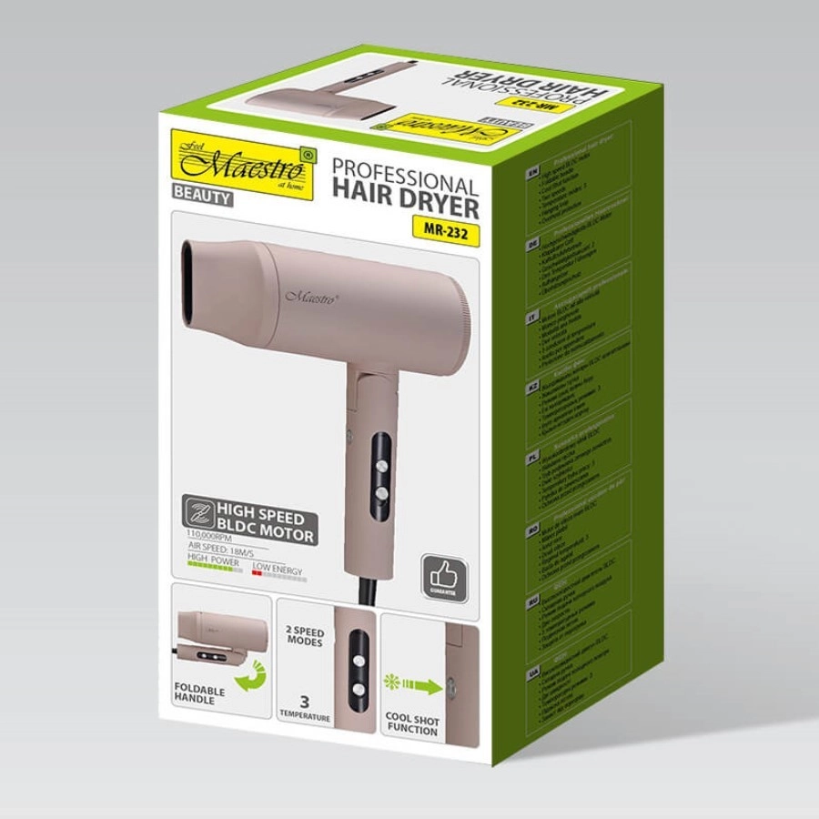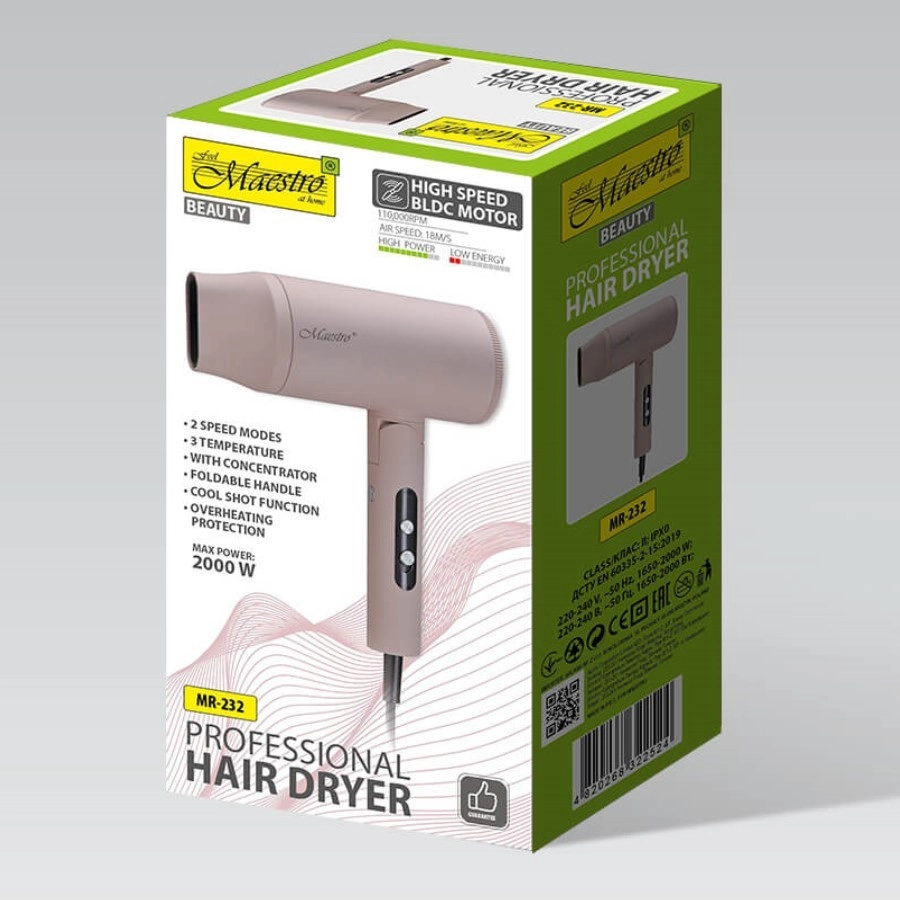 De MAESTRO MR-232 is een ideale keuze voor dagelijks gebruik en reizen. Dankzij de BLDC‑motor met lange levensduur en 2000 W vermogen droogt hij haar snel en mild, terwijl de luchtstroom van 18 m/s ook dik en lang haar aankan. Nauwkeurige instelling via 2 snelheden en 3 temperatuurstanden wordt aangevuld met koude lucht voor de finale fixatie en glans.