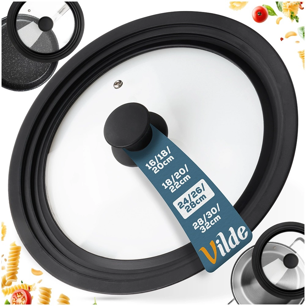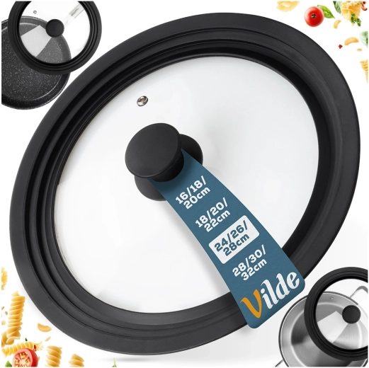 Praktische universele 3-in-1 deksel voor potten en pannen met een diameter van 24, 26 en 28 cm bespaart ruimte in de keuken en zorgt voor perfecte afdichting. Dankzij de brede siliconen rand beschermt hij de randen van het kookgerei, het doorzichtige geharde glas maakt kookcontrole mogelijk en de geïntegreerde stoomopening voorkomt overkoken. Vaatwasserbestendig, hittebestendig en uitgerust met een ergonomische greep. Origineel product van het merk VILDE.