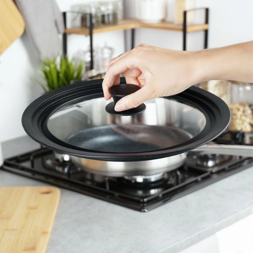 Breng voorgoed orde in je deksels. Dit universele 3-in-1 glazen deksel vervangt drie afzonderlijke maten (24/26/28 cm) en sluit dankzij de brede siliconen rand perfect aan op verschillende soorten potten en pannen. Het transparante geharde glas laat je gerechten volgen zonder het deksel op te tillen, wat energie en tijd bespaart.