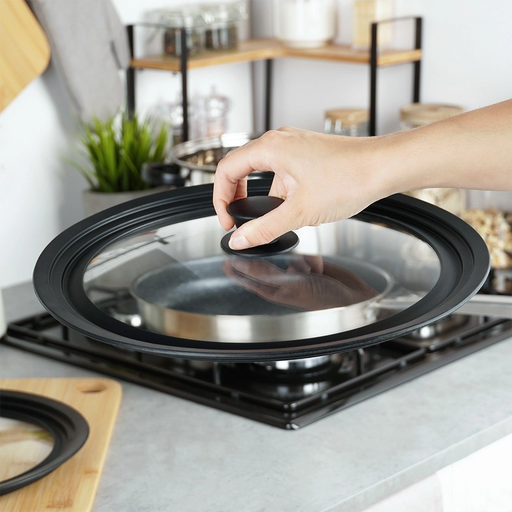 De universele siliconen rand past zich aan drie panmaten aan, waardoor het drie afzonderlijke deksels vervangt en ruimte in je keuken bespaart.