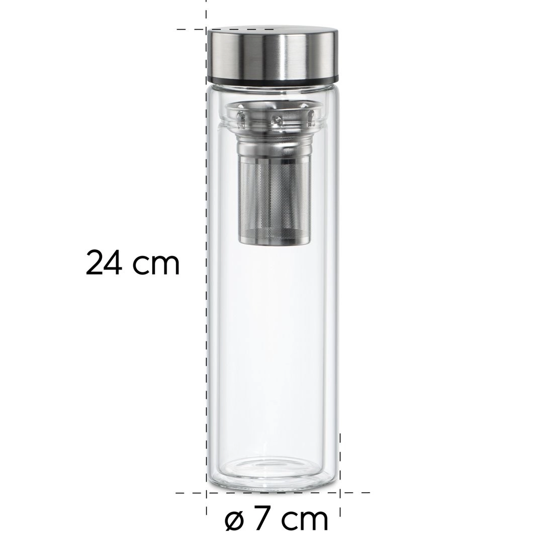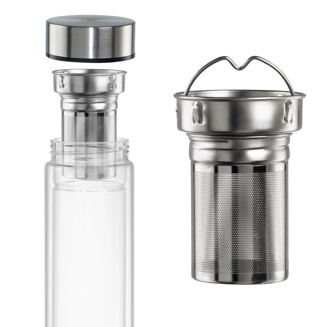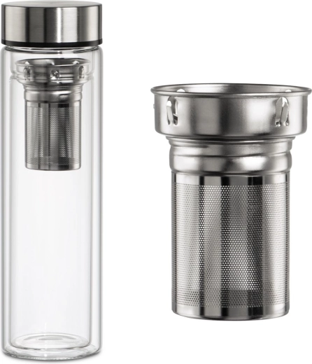 Dankzij het hoogwaardige borosilicaatglas is de fles licht, duurzaam en smaakneutraal. De roestvrijstalen dop met siliconen afdichting voorkomt lekken in tas of rugzak. De uitneembare fijne zeef met praktische greep vergemakkelijkt hantering en reiniging.