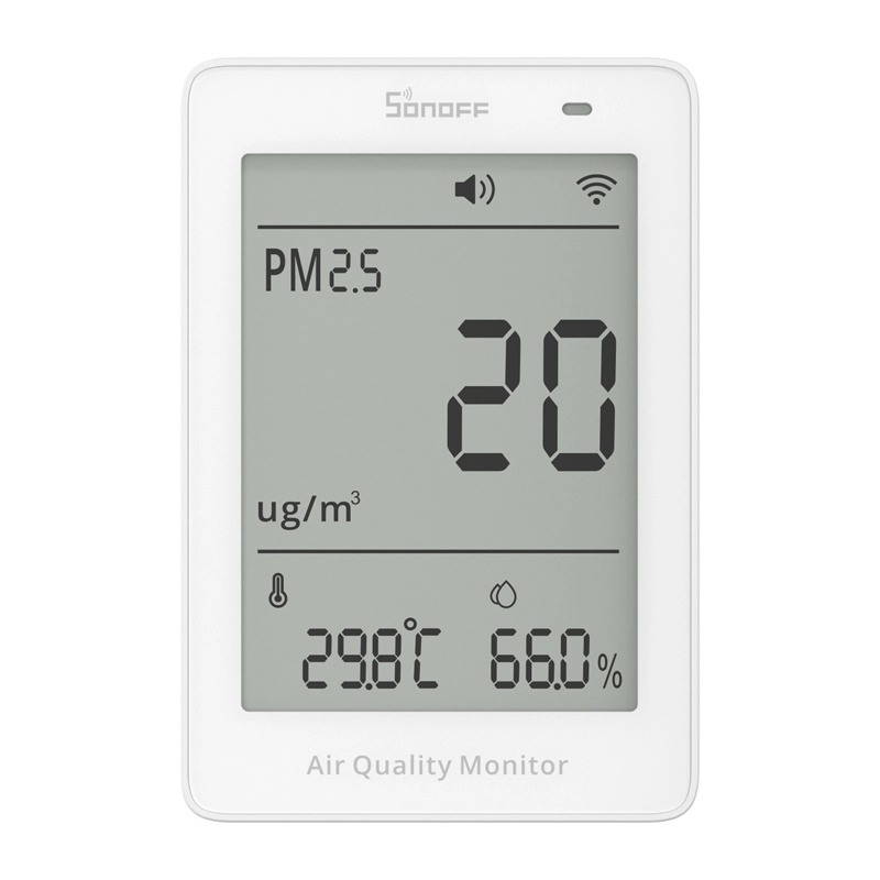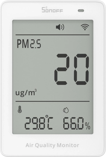 De compacte Sonoff AirGuard-luchtkwaliteitsmonitor biedt nauwkeurige metingen van PM2.5 en PM10, temperatuur en luchtvochtigheid in realtime. Dankzij Wi‑Fi‑verbinding, integratie met de Matter-standaard en een duidelijk 3,73" LCD‑display volg je eenvoudig de omstandigheden thuis en op kantoor. Inclusief gegevensgeschiedenis tot 1 jaar, slimme meldingen, akoestische en visuele alarmen en comfortabele bediening via app of spraak.