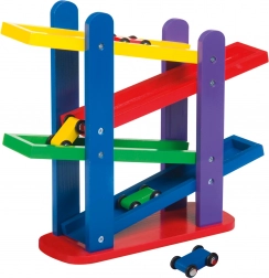 Met deze houten racebaan duiken je kinderen in een wereld van plezier en snelle races. De baan is zo ontworpen dat de autootjes vanaf het hoogste punt makkelijk naar beneden rijden en zichzelf weer omklappen. Kinderen zullen er keer op keer van genieten om de autootjes te bekijken en te laten rijden.