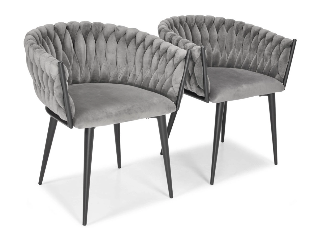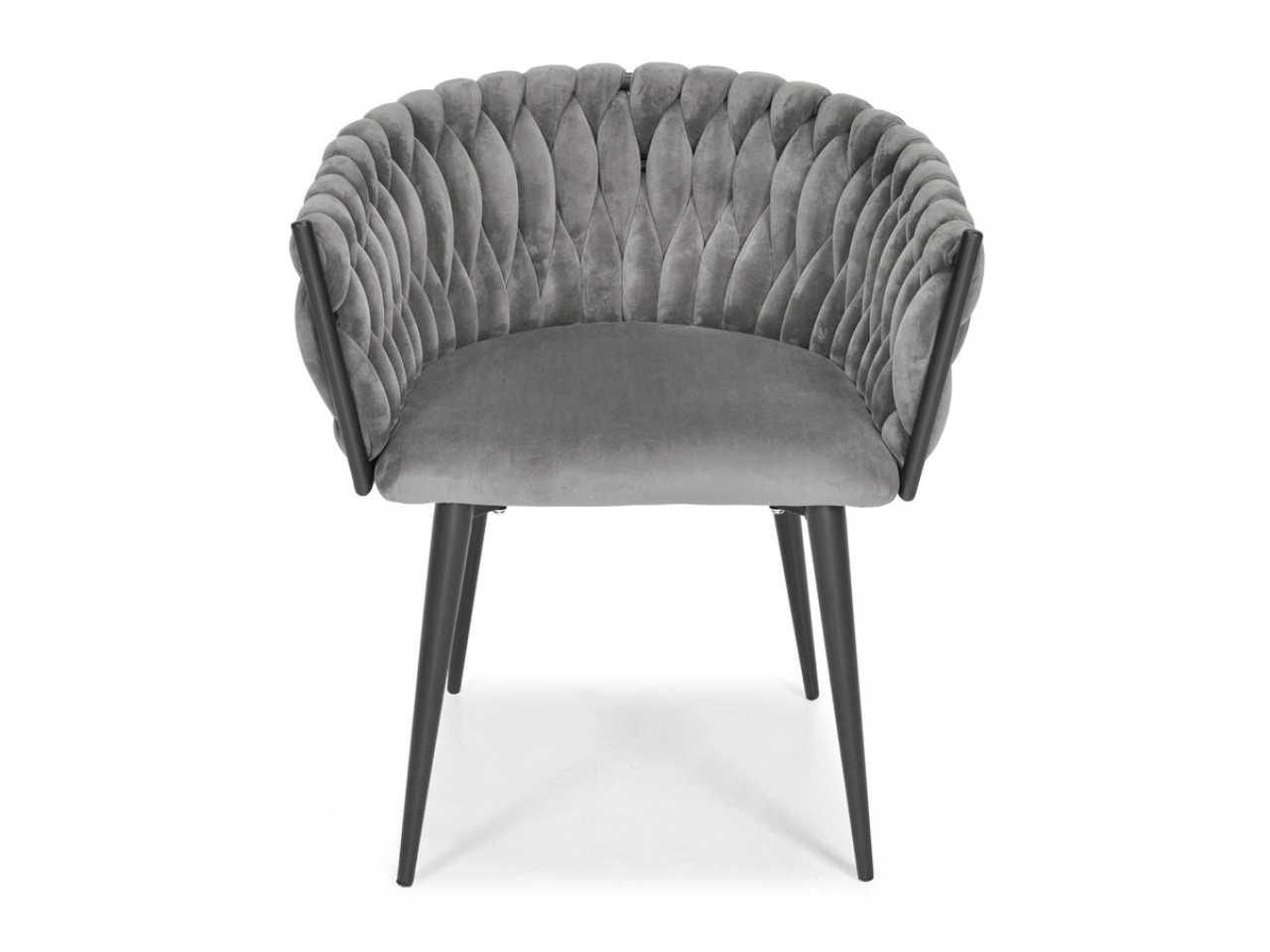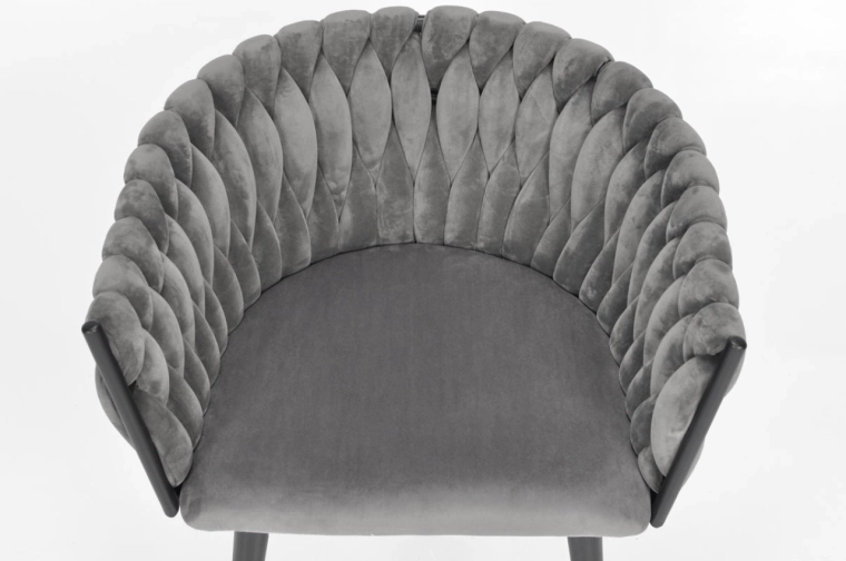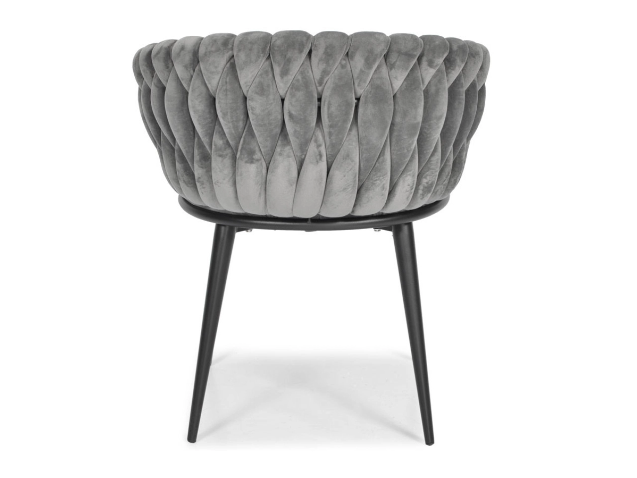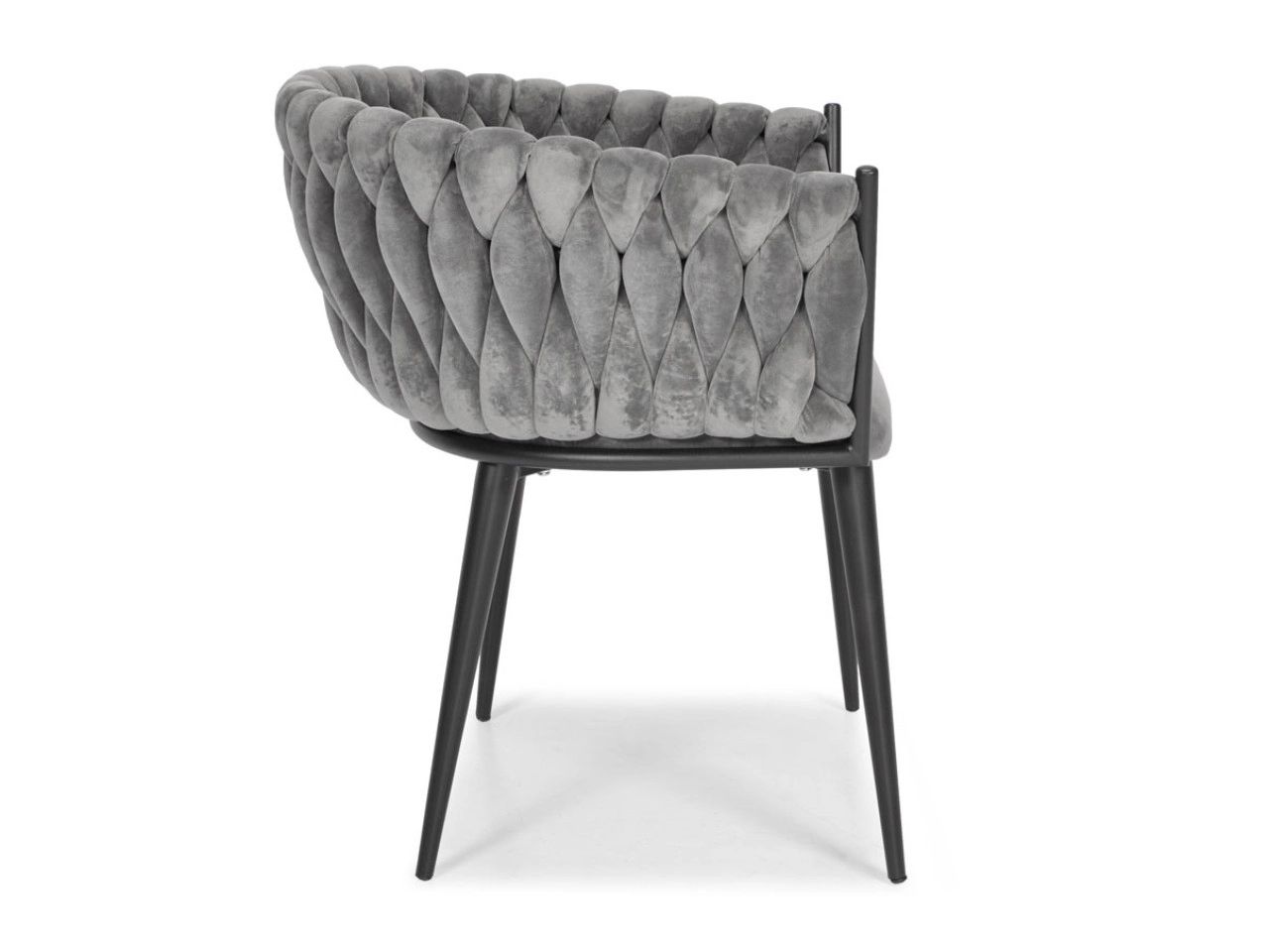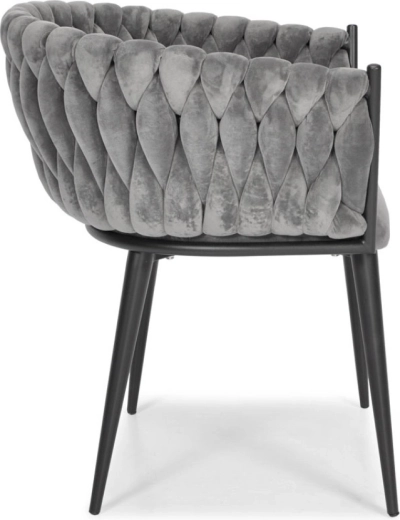 Breng elegantie en comfort in huis in moderne glamourstijl. De fluwelen bekleding met subtiele glans oogt luxueus en vormt een prachtig contrast met de zwarte, slanke metalen poten. De opvallende gevlochten rugleuning is een decoratief element dat direct in het oog springt en de stoel tot een designstatement in de ruimte maakt.