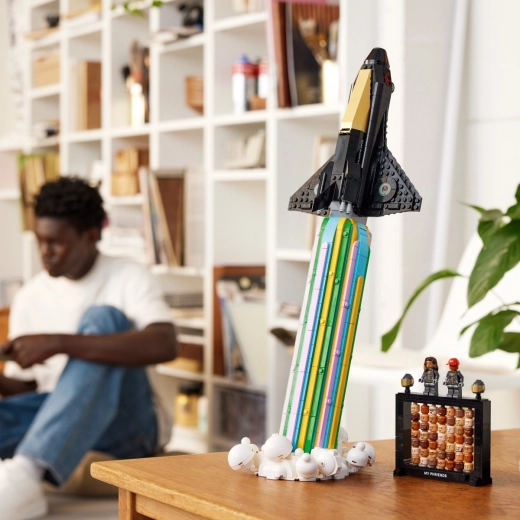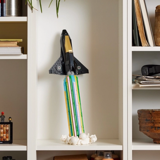 Doordachte details maken elke bouwer blij: een openende cockpit, een afneembaar landingsgestel en twee ruimtehelmen met gouden vizieren. De shuttle is eenvoudig te tonen in een dynamische “launch”-pose dankzij de stevige basis met motorduw-effect – een perfecte decoratie voor plank of tafel.