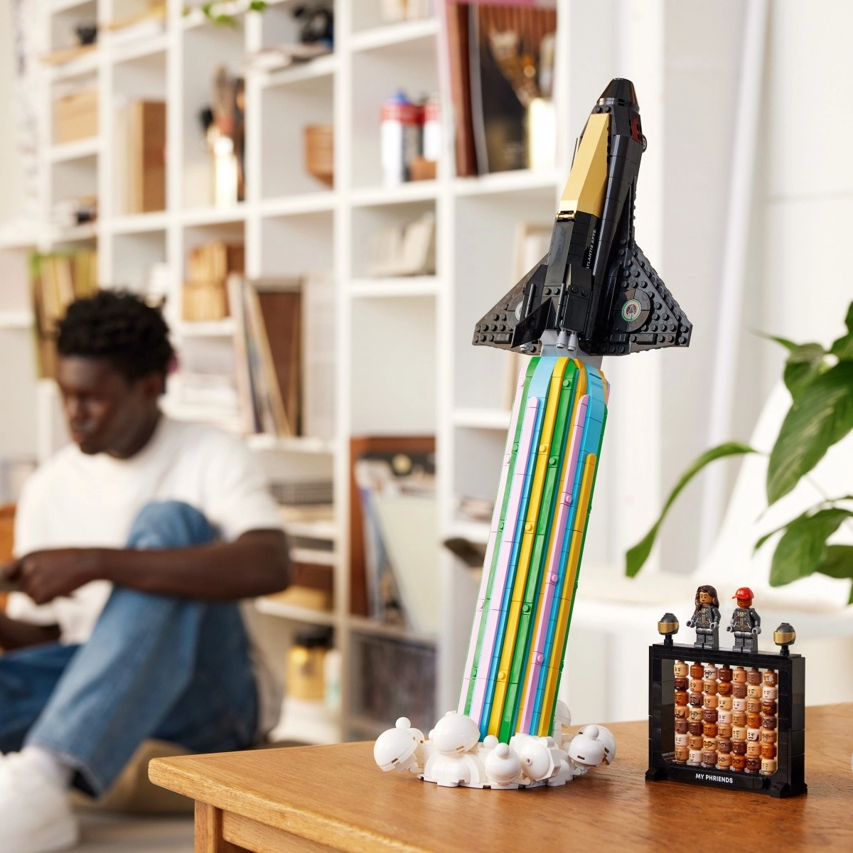 Bouw een verbluffende shuttle die naar de sterren reikt en breng een dosis inspiratie en vreugde in huis. Dit verzamelmodel van LEGO Icons vangt het lanceringsmoment op een kleurrijke wolk van vlammen en rook, aangevuld met exclusieve minifiguren van PHARRELL en HELEN WILLIAMS.