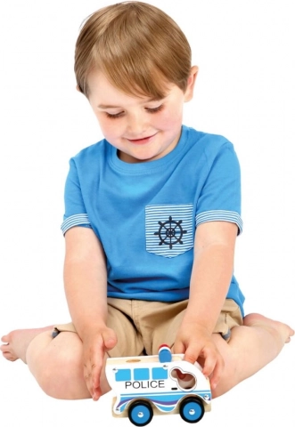 Het robuuste houten politiewagentje van Bino maakt alle kleine wetshandhavers blij. Het is gemaakt van kwalitatief hout en metalen onderdelen, heeft gladde randen, ligt fijn in de hand en stimuleert de fantasie, fijne motoriek en rollenspel. Een perfecte aanvulling op de collectie met de brandweerwagen en de ambulance uit dezelfde serie.