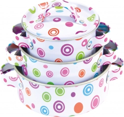 Deze kwaliteitsset geëmailleerde kinderkeukenspullen is ideaal voor rollenspellen als kok of kleine huishoud(st)er. Metalen pannen, koekenpan en gerei ogen authentiek, zodat kinderen kunnen genieten van realistisch koken en serveren. De kleurrijke stippen op witte ondergrond geven de hele set een vrolijke uitstraling die elke kinderspeelhoek opfleurt.