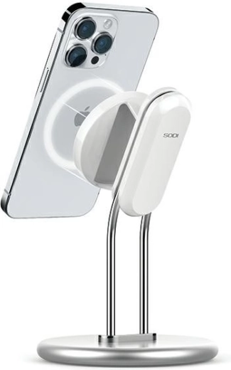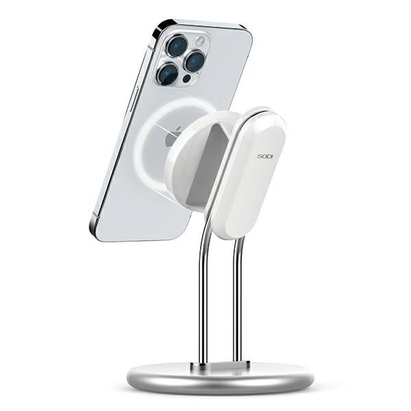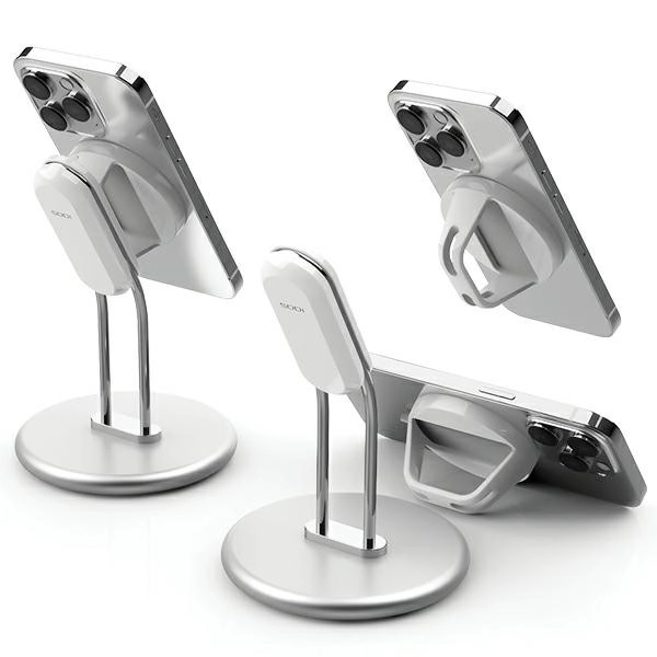 Elegante magnetische standaard van een aluminiumlegering met afneembare houder biedt stevige stabiliteit, compatibiliteit met MagSafe en comfortabele handsfree weergave van video’s, games en videogesprekken. Zachte siliconen voetjes beschermen de tafel, de verstelbare hoek zorgt voor uitstekende kijkhoeken en de verwisselbare magnetische plaat maakt het mogelijk om de originele MagSafe draadloze oplader te plaatsen (niet inbegrepen).