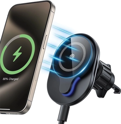 Geniet van comfortabel en veilig telefoongebruik tijdens het rijden. Deze magnetische houder met MagSafe-technologie biedt snel draadloos opladen van 15 W en een stevige bevestiging zonder gewiebel. De verbeterde stalen clip met haak is 50% langer, waardoor hij beter past op de meeste horizontale en verticale roosters en oneffenheden in de weg weerstaat.