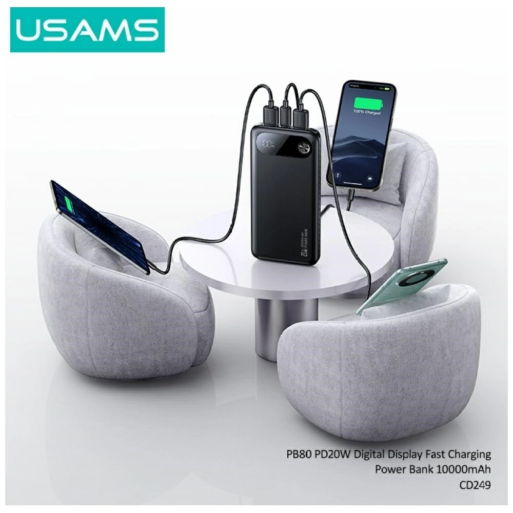 Op zoek naar een lichte en krachtige powerbank die je apparaten de hele dag draaiende houdt? De USAMS PB80 biedt een capaciteit van 10.000 mAh en ondersteuning voor Power Delivery 20 W voor razendsnel opladen van compatibele telefoons en accessoires. Dankzij USB‑C en 2× USB‑A laad je eenvoudig meerdere apparaten tegelijk op – van smartphone tot oordopjes en smartwatches.