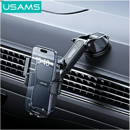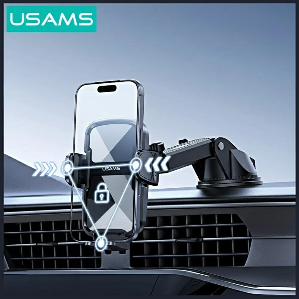 De praktische en stabiele USAMS-autohouder voor montage op de voorruit of het dashboard zorgt voor veilige bevestiging van de telefoon, stevige grip dankzij een krachtige zuignap en eenvoudige hoekverstelling voor comfortabele navigatie en handsfree bellen.