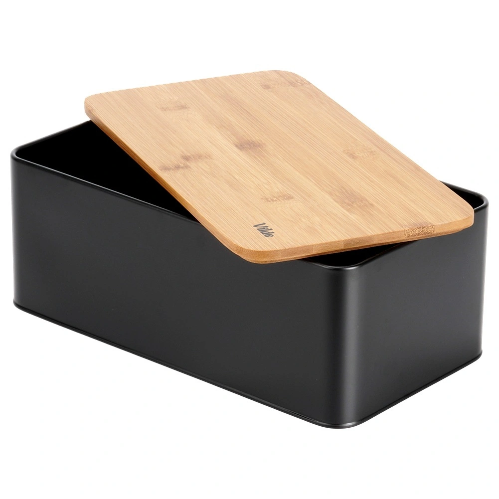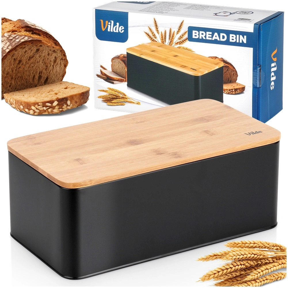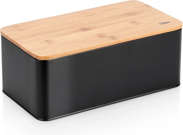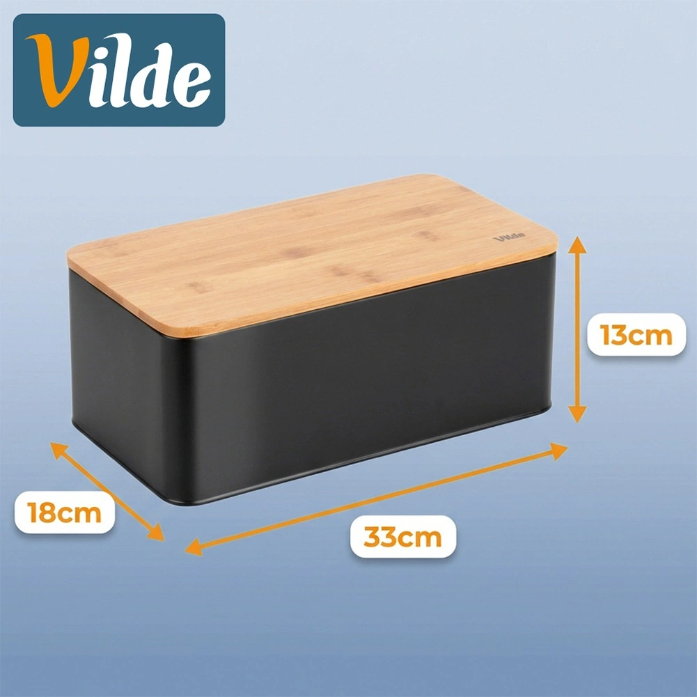 Ruime broodtrommel in modern zwart combineert een duurzame metalen behuizing met een natuurlijk bamboe deksel dat tevens als snijplank dient. Afmetingen 33 × 18 × 13 cm bieden voldoende ruimte voor brood, baguettes en broodjes, terwijl de stevige constructie het gebak beschermt tegen deuken.