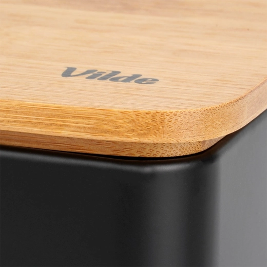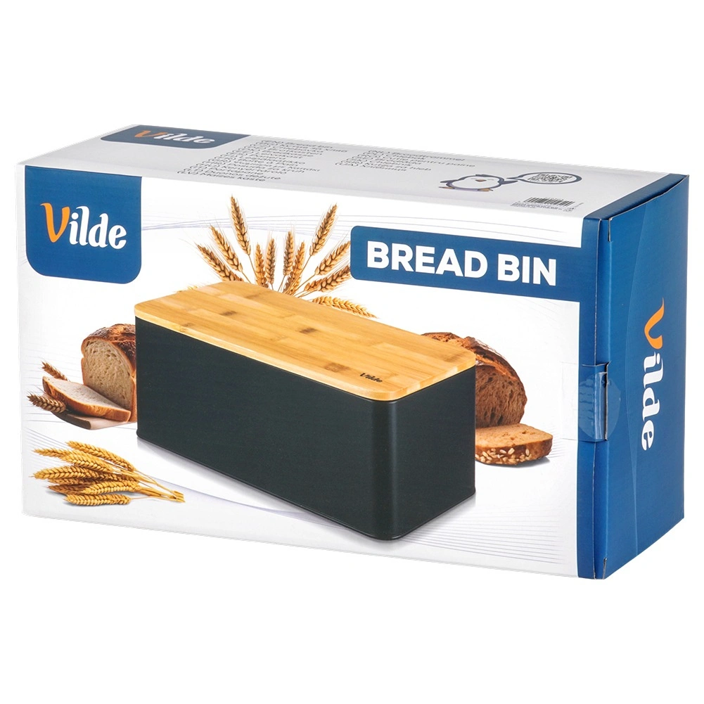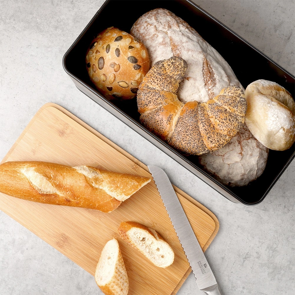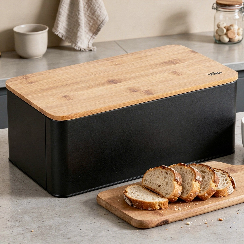 Ruime broodtrommel in modern zwart combineert een duurzame metalen behuizing met een natuurlijk bamboe deksel dat tevens als snijplank dient. Afmetingen 33 × 18 × 13 cm bieden voldoende ruimte voor brood, baguettes en broodjes, terwijl de stevige constructie het gebak beschermt tegen deuken.
