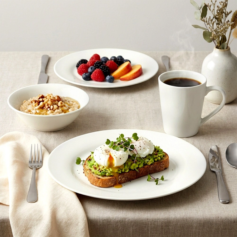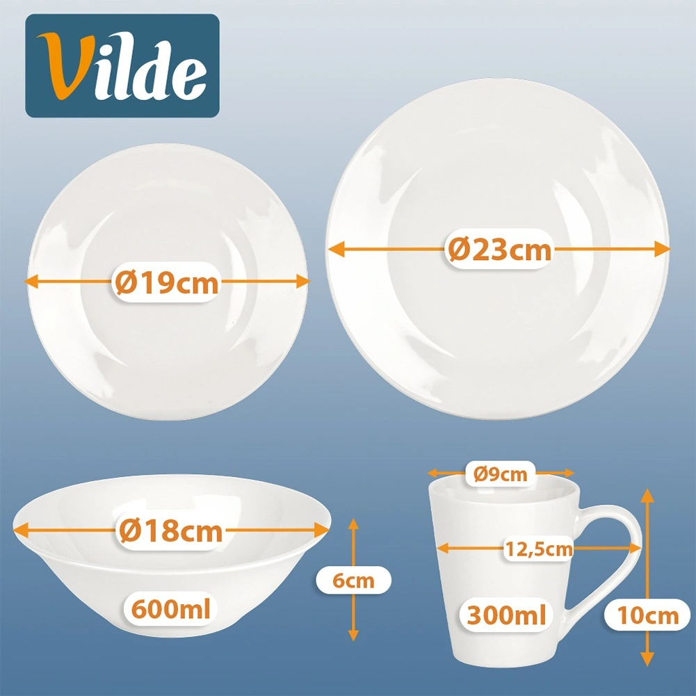 Inhoud van de set: 4 kommen 18 × 6 cm (600 ml), 4 platte borden 23 × 23 × 2 cm, 4 dessertborden 19 × 19 × 2 cm, 4 mokken 12,5 × 9 × 10 cm (300 ml). Het servies is ideaal voor soepen, salades, hoofdgerechten en desserts; de mokken zijn perfect voor koffie en thee. Eenvoudig onderhoud in de vaatwasser en veilig opwarmen in de magnetron besparen elke dag tijd.