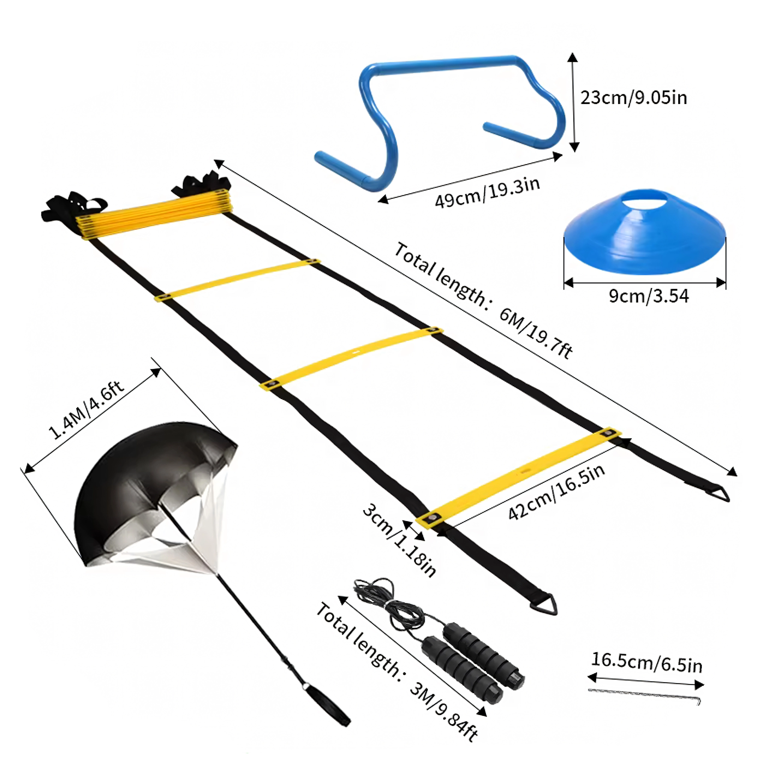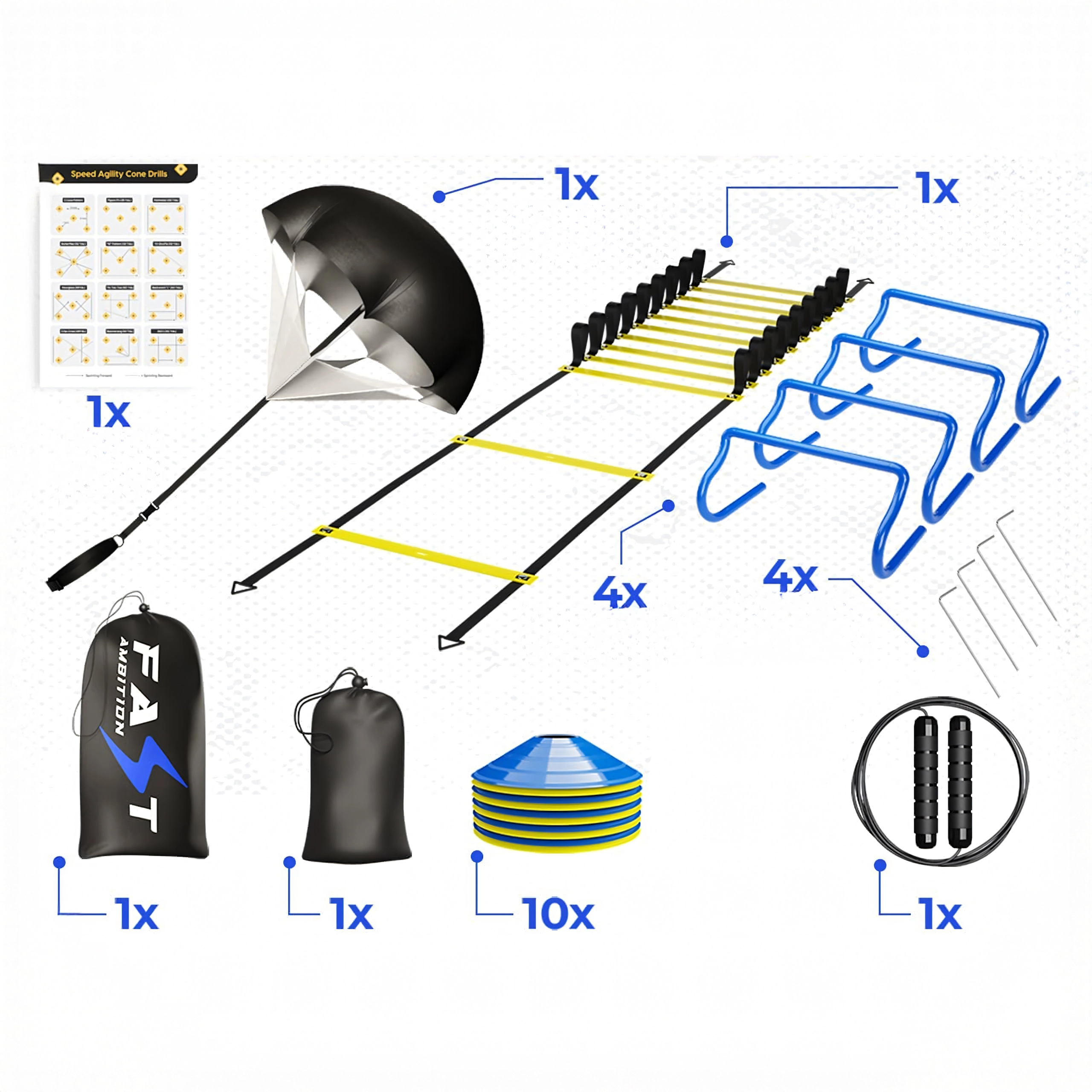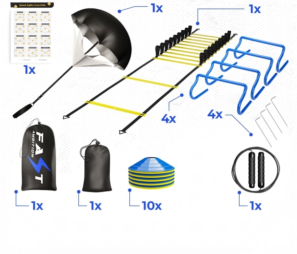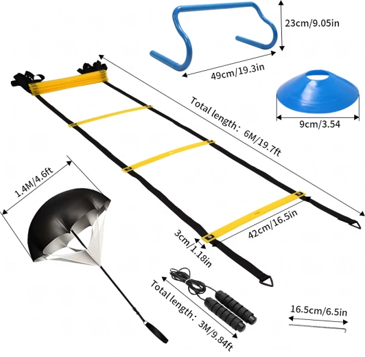 Complete trainingsset voor snelheid, wendbaarheid en coördinatie, inclusief een coördinatieladder, mini-hindernissen, markeringspionnen, springtouw, grondpennen en een weerstandsparachute. Ideaal voor voetbal, atletiek en thuisconditietraining. Dankzij de verstelbare sporten, de duurzame uitvoering en de praktische draagtassen is de set eenvoudig mee te nemen en klaar voor intensieve drills, waar dan ook.