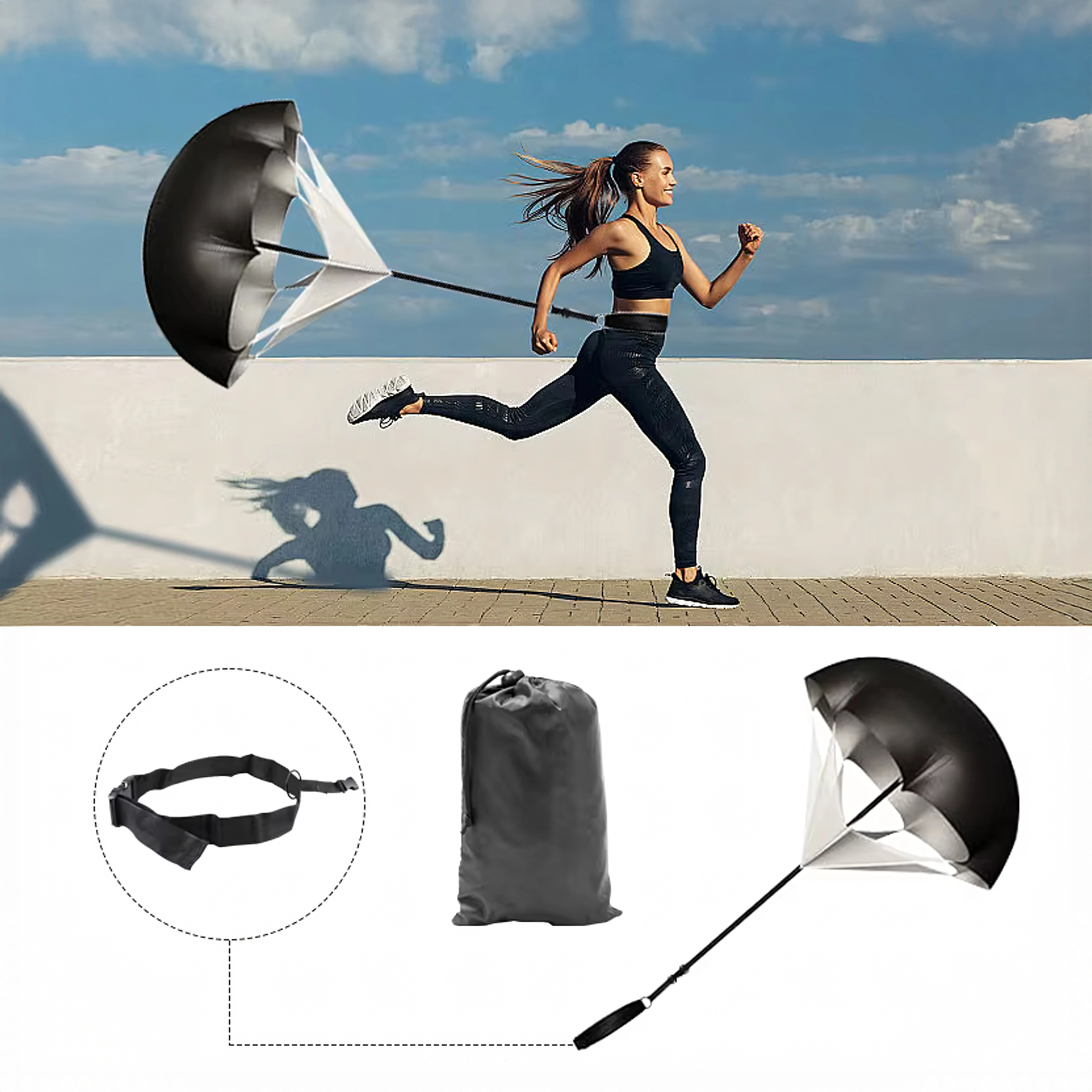 De lichte parachute-belasting verhoogt de weerstand tijdens sprints en helpt zowel acceleratie als topsnelheid te ontwikkelen. De verstelbare heupband blijft stevig op zijn plaats en de parachute is eenvoudig op te vouwen in de meegeleverde tas.