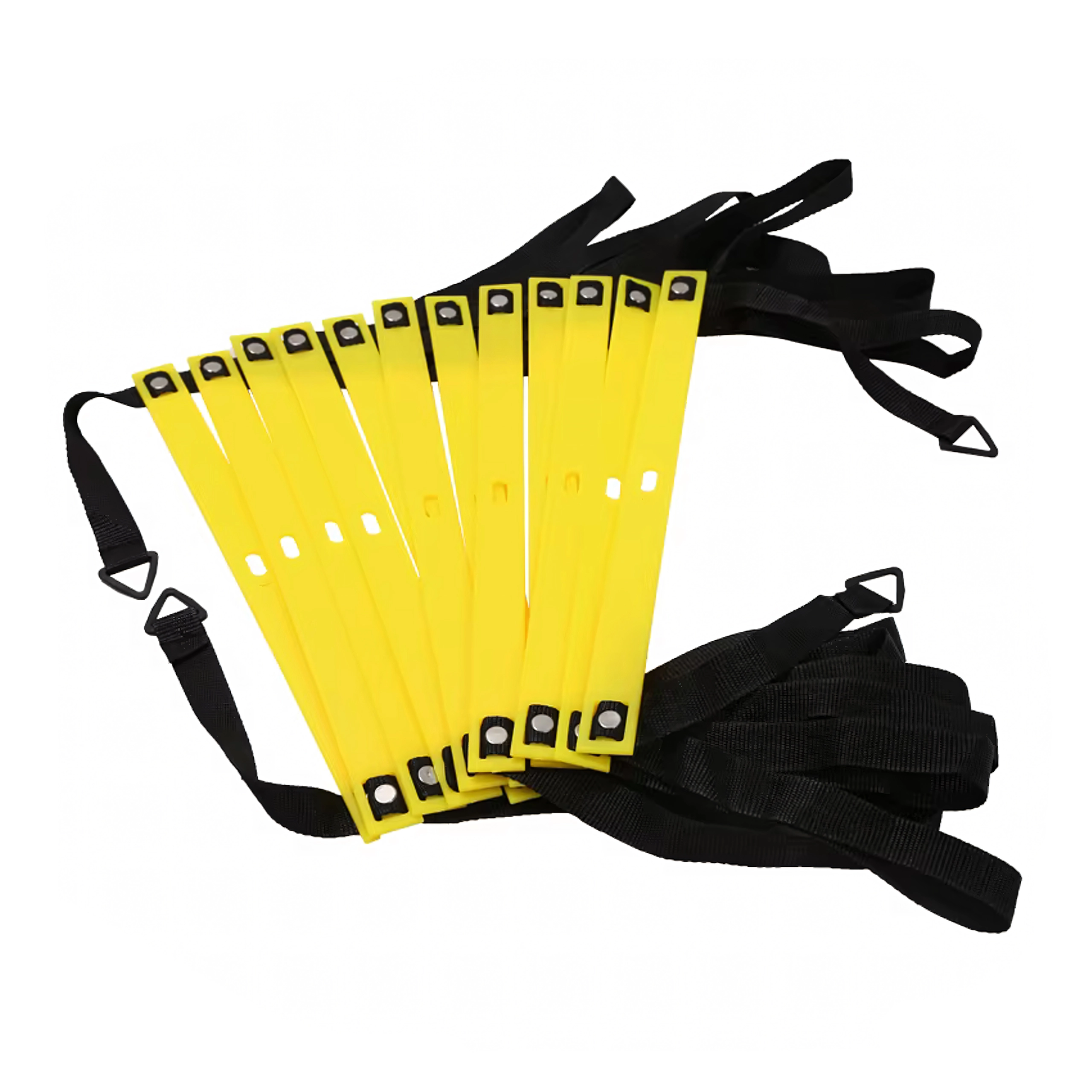 Platte gele sporten op stevige banden zijn eenvoudig te verschuiven. Ideaal voor snelle passen, laterale beweging en het verbeteren van balans en loopritme.