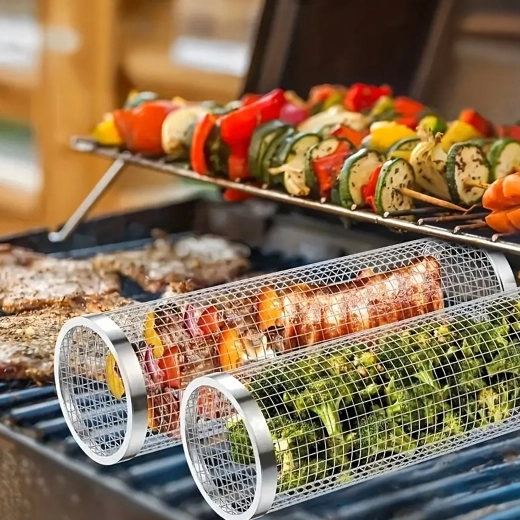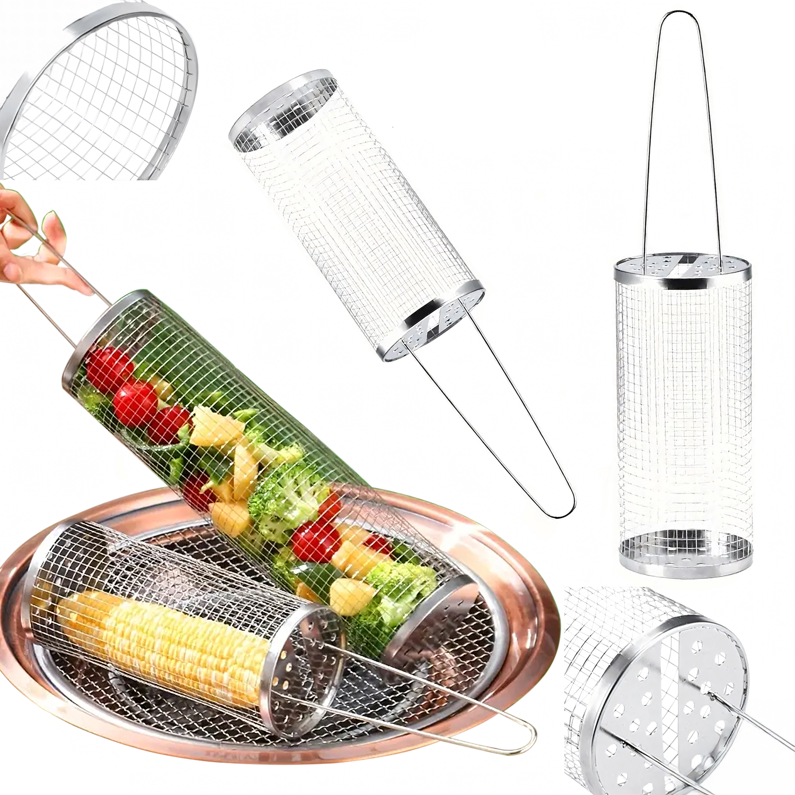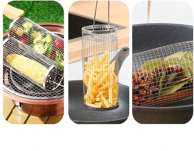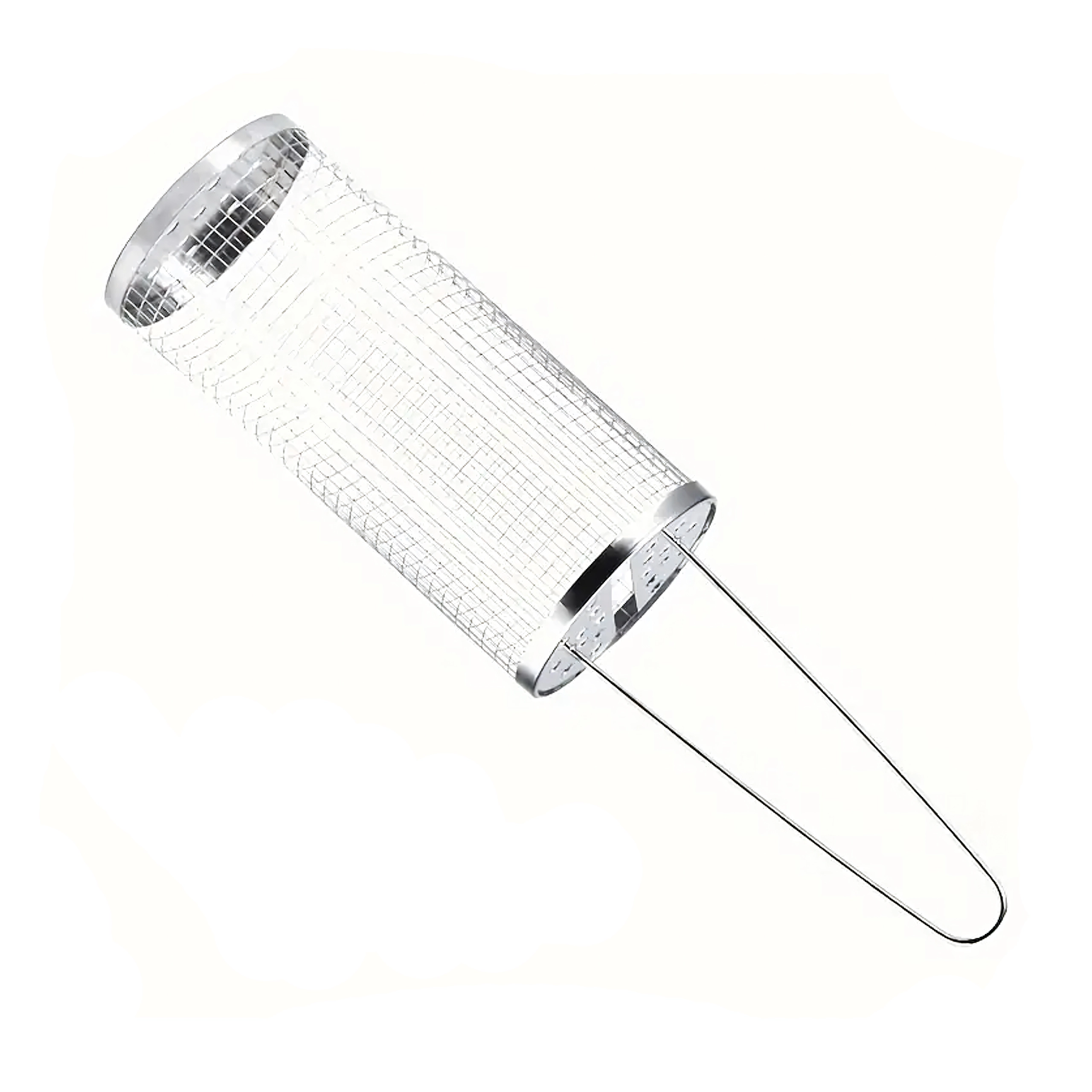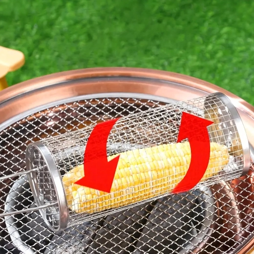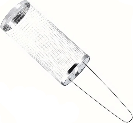 De cilindrische mand van roestvrij staalgaas is ideaal voor het grillen van kleine ingrediënten die anders door het rooster zouden vallen. De fijne perforaties laten warmte en rook door, zodat je een krokante buitenkant en een sappige binnenkant bereikt zonder rommel op de grill. Het draaibare ontwerp maakt egale garing mogelijk zonder afzonderlijke stukjes te hoeven keren.