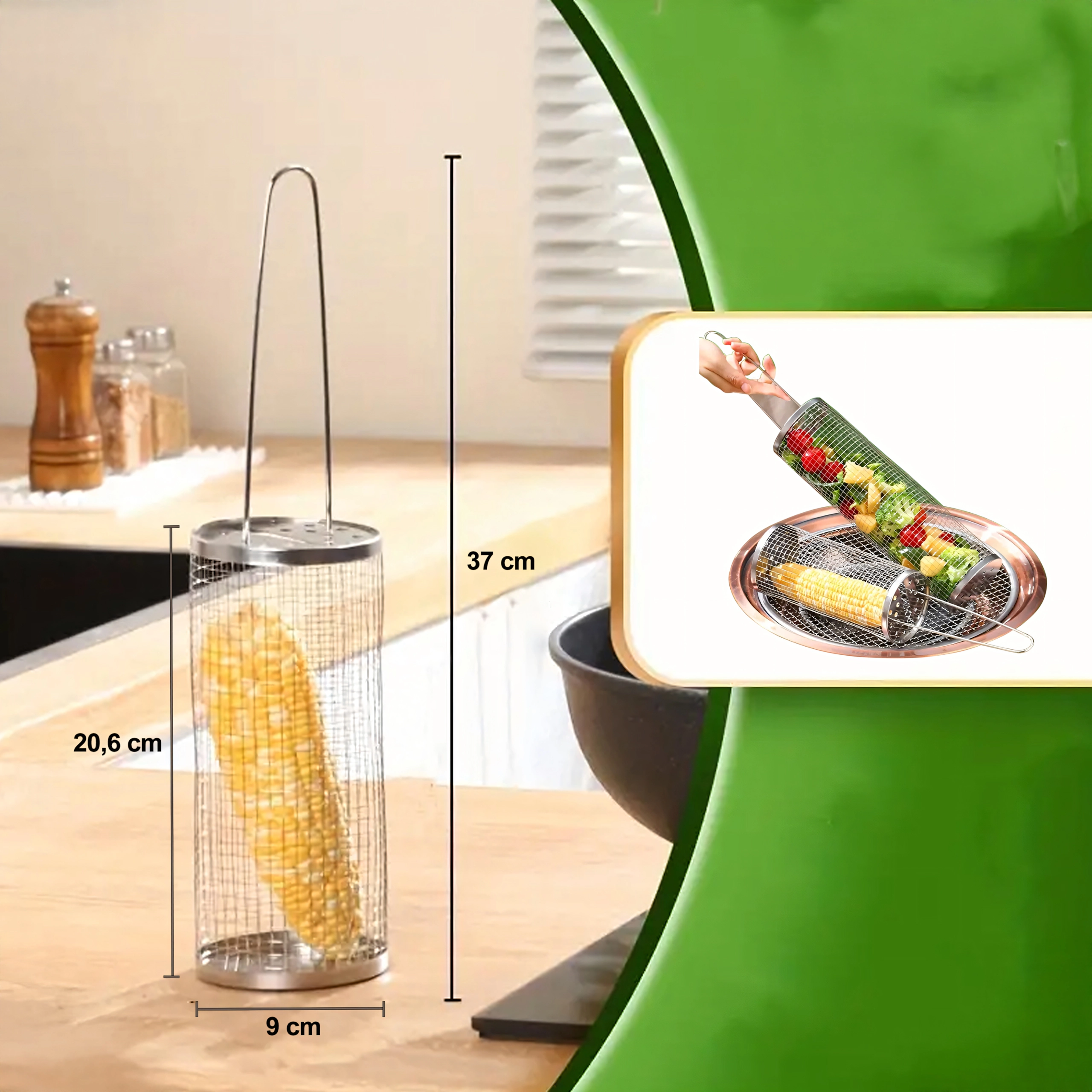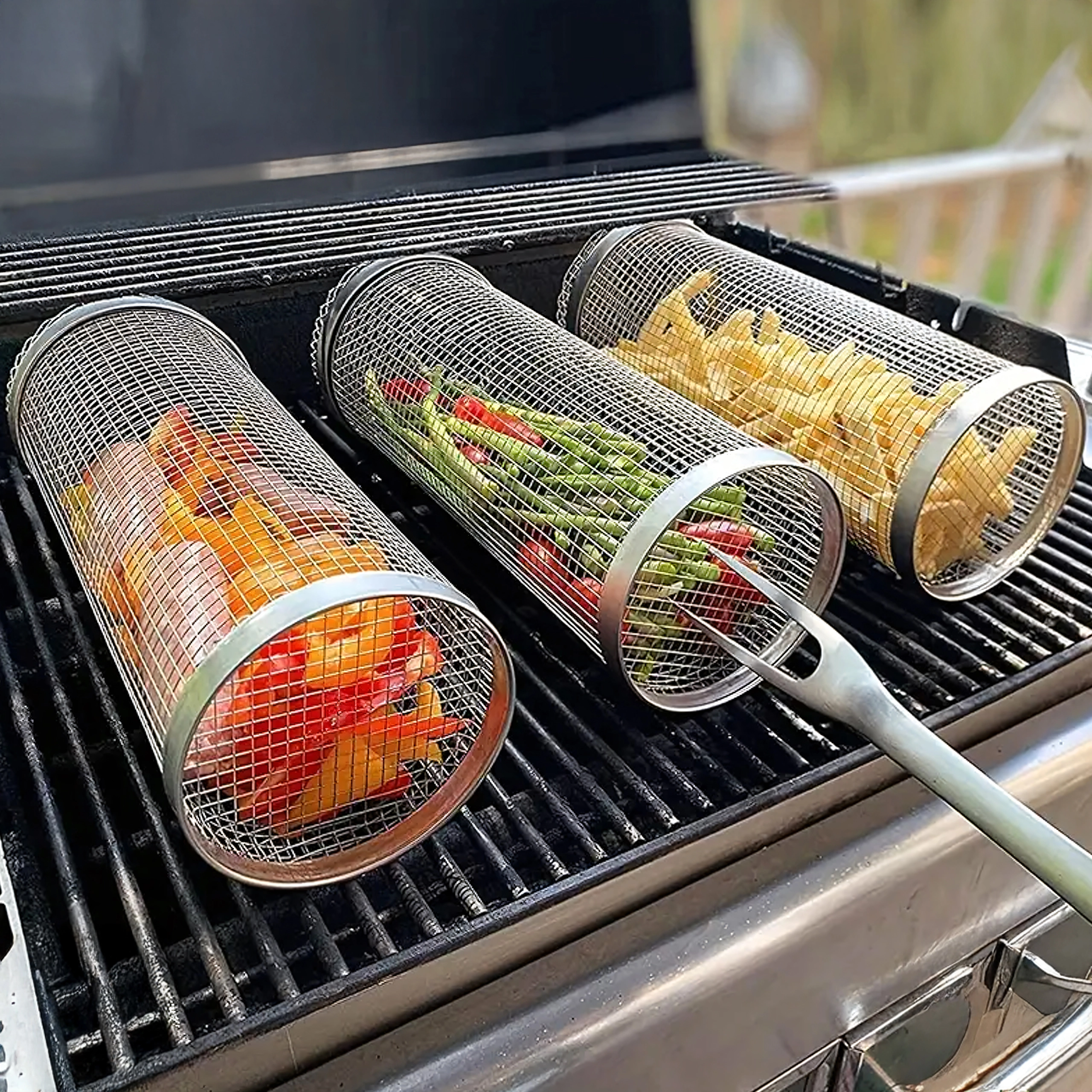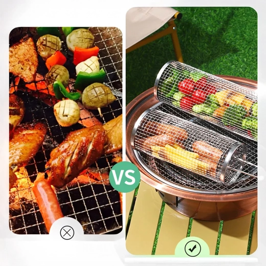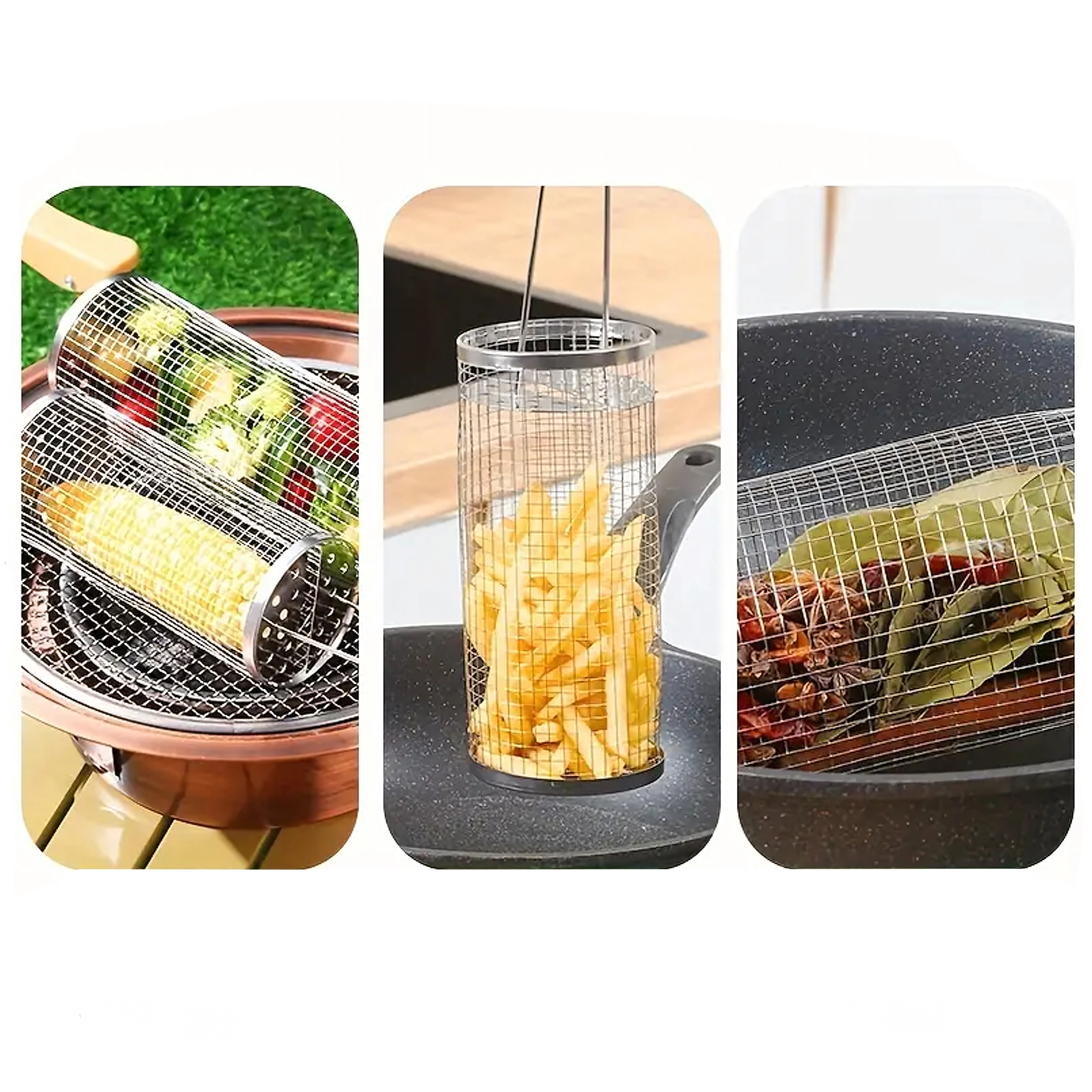 De cilindrische mand van roestvrij staalgaas is ideaal voor het grillen van kleine ingrediënten die anders door het rooster zouden vallen. De fijne perforaties laten warmte en rook door, zodat je een krokante buitenkant en een sappige binnenkant bereikt zonder rommel op de grill. Het draaibare ontwerp maakt egale garing mogelijk zonder afzonderlijke stukjes te hoeven keren.