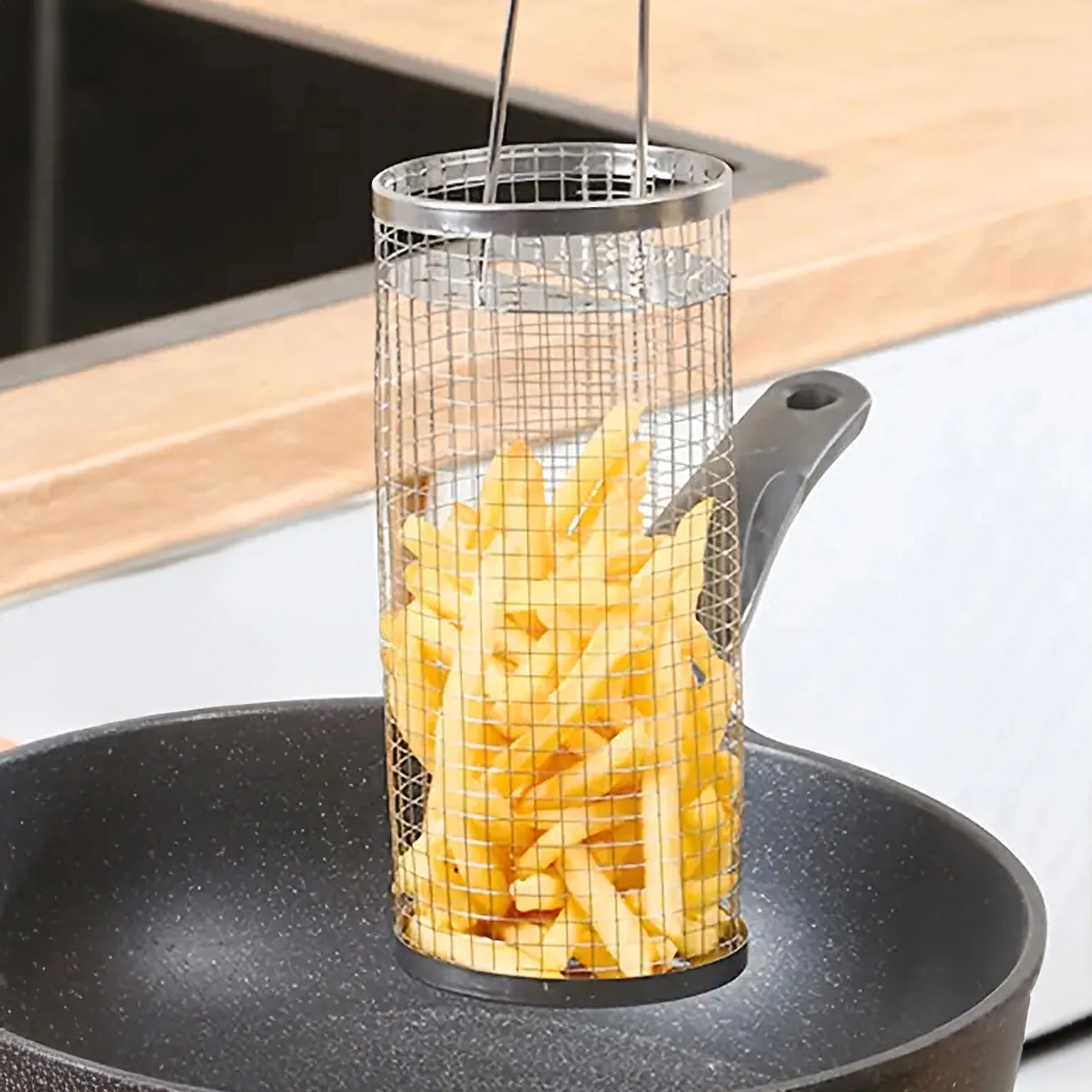 De robuuste roestvrijstalen constructie weerstaat hoge temperaturen en is makkelijk te reinigen. De lange draadhendel zorgt voor een veilige grip en comfortabel draaien, zelfs boven een loeihete grill. Perfect voor groenten, aardappelen, friet, kleinere stukjes vlees, vis en zeevruchten.