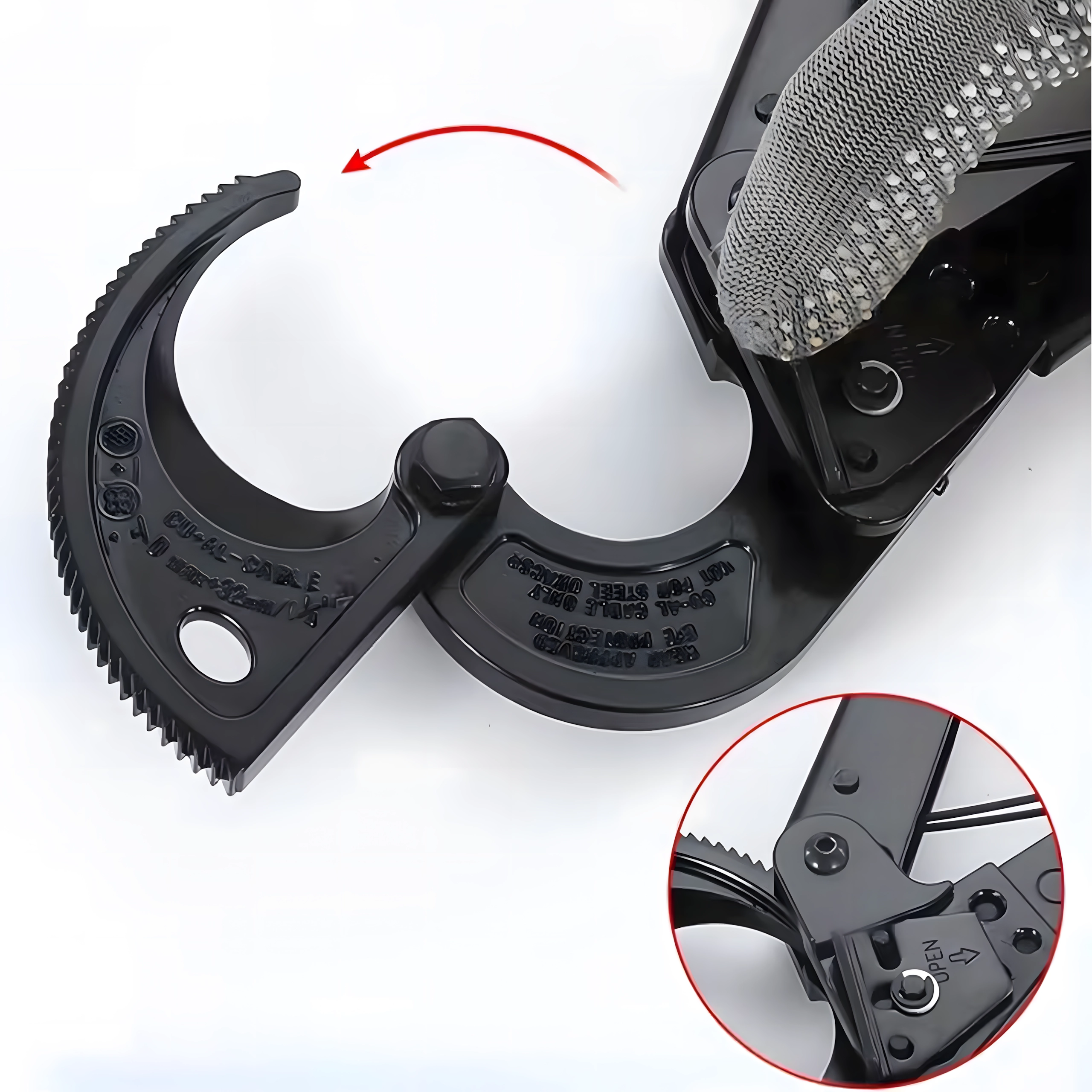 De stapsgewijze vergrendeling vergroot de hefboomwerking en maakt een soepele, gecontroleerde snede mogelijk, zelfs bij zeer dikke kabels.