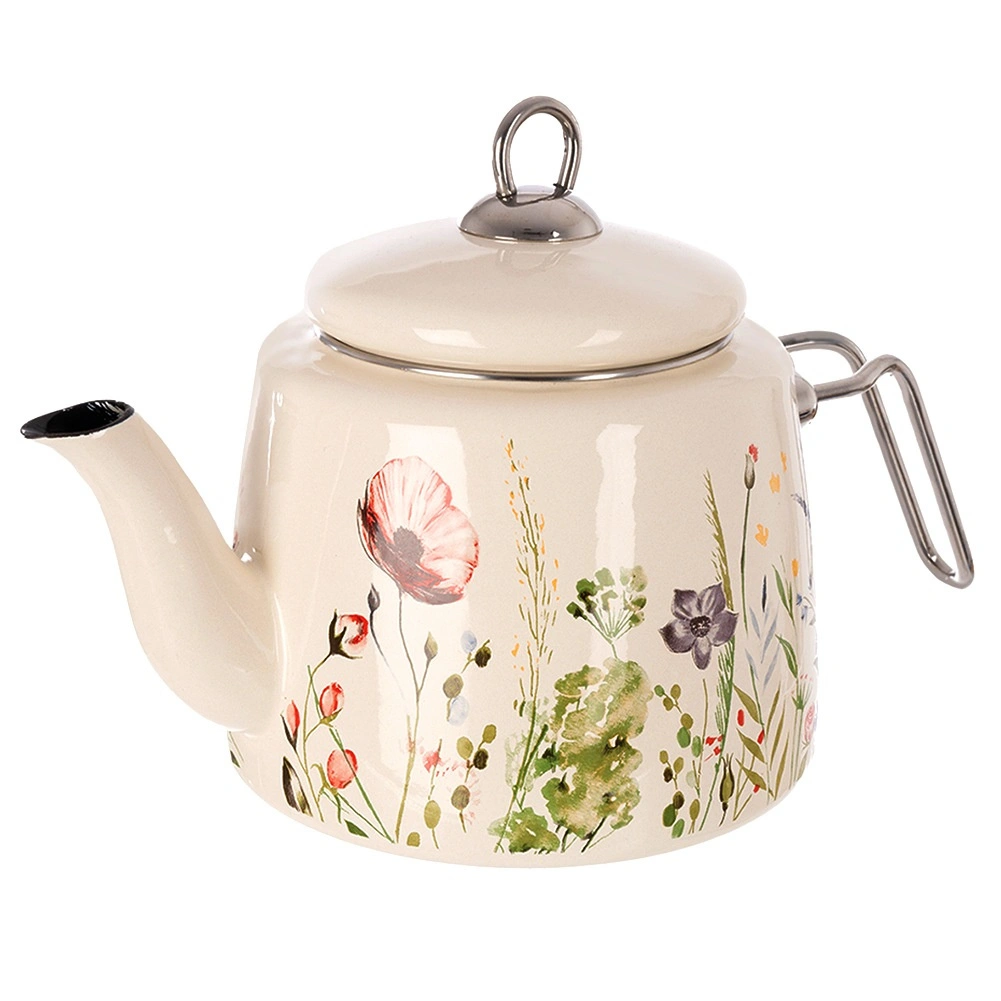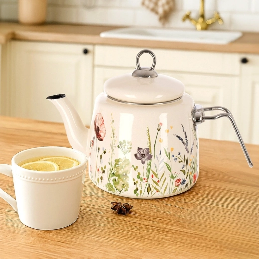 De stijlvolle crèmekleurige theeketel met bloemendecor is ideaal voor het dagelijks koken van water voor thee, koffie of kruiden, en ook geschikt om direct op tafel te serveren. Het duurzame geëmailleerd staal is veilig voor de gezondheid en geschikt voor mensen met allergieën, terwijl de roestvrijstalen details zorgen voor stevigheid en een lange levensduur.